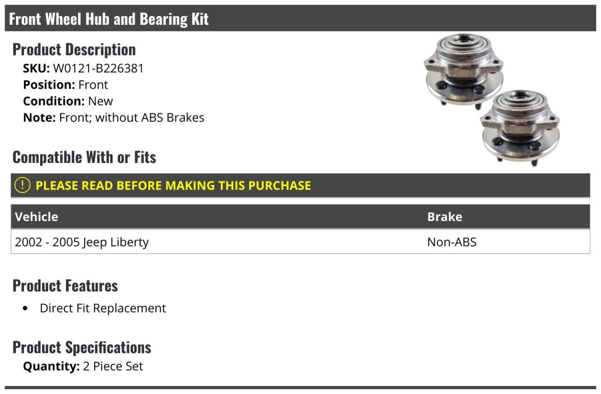 - Front Wheel Hub And Bearing Kit 2 Piece For 2002-2005 Jeep Liberty Without Abs Brakes