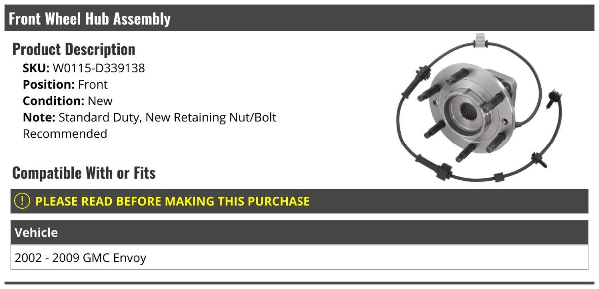 - Front Wheel Hub Assembly Standard Duty For 2002-2009 Gmc Envoy