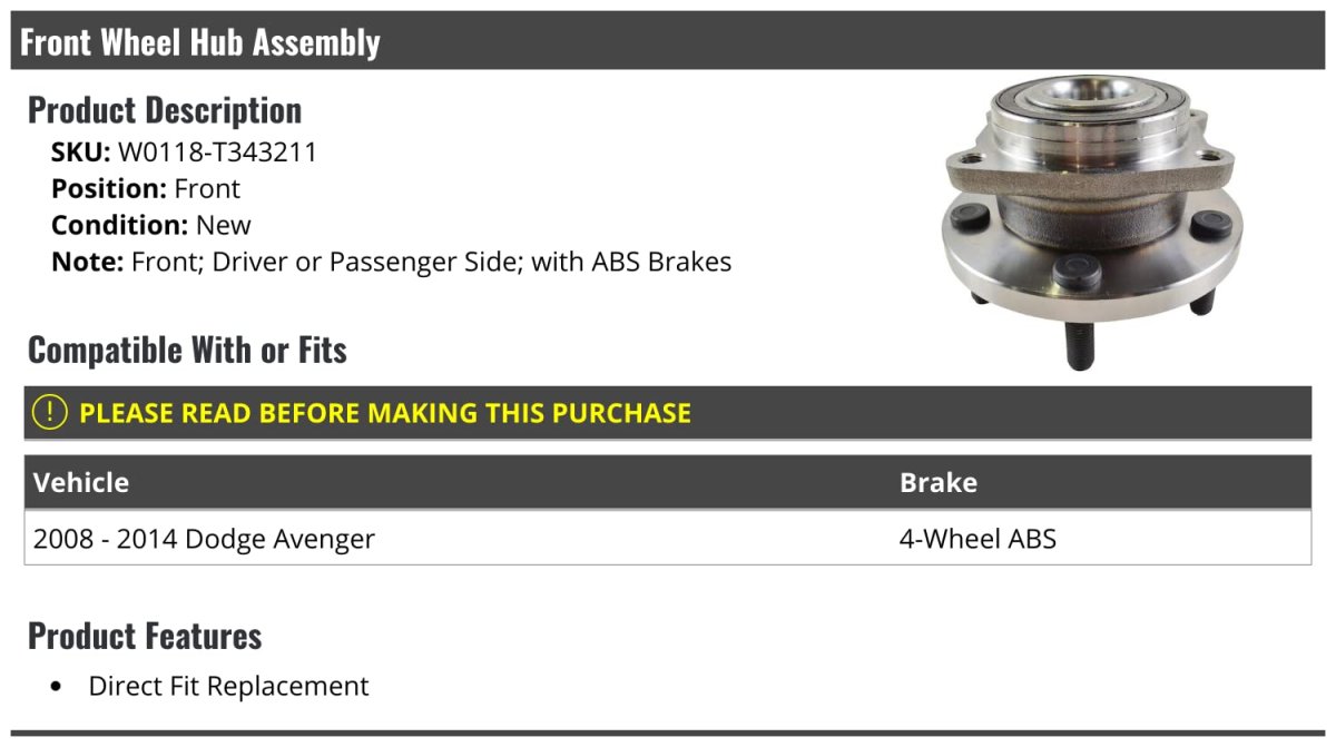 - Front Wheel Hub Bearing Assembly For 2008-2014 Dodge Avenger With Abs Brakes