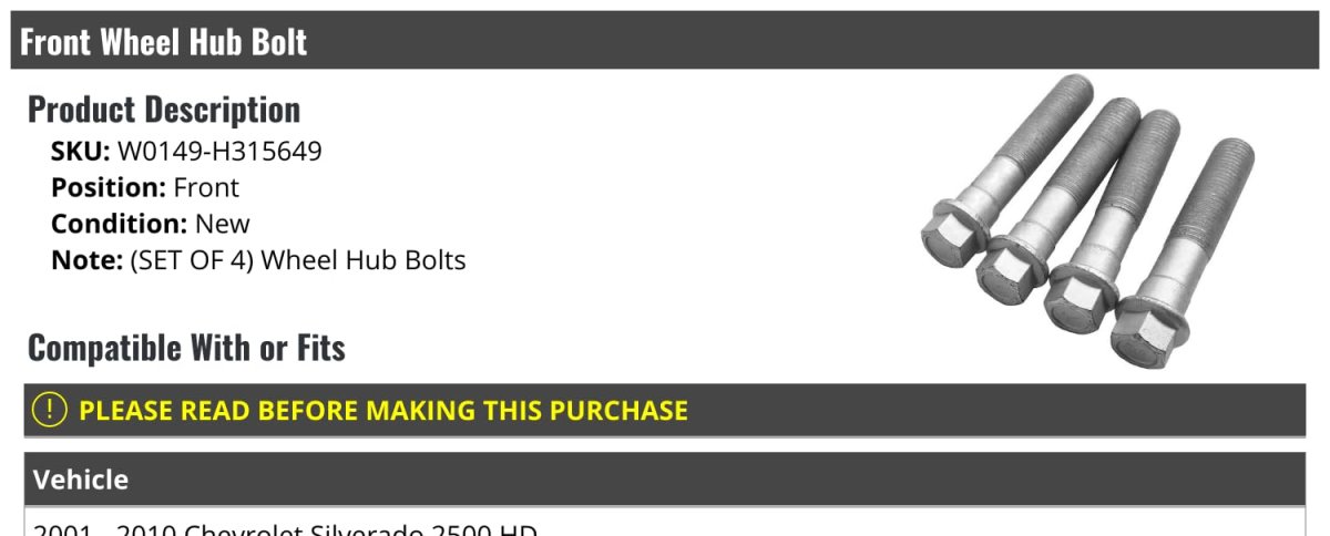 (Set of 4) Front Wheel Hub Bearing Bolts. Compatible with or fits: 2001 - 2010 Chevy Silverado 2500 HD. Front Wheel Hub Bolt. Review Description to Ensure Proper Fit. OE Quality.