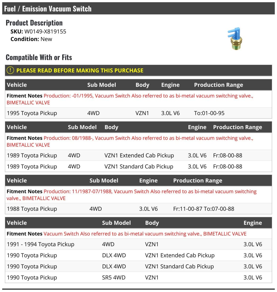 Compatible with or fits: 1989 Toyota Pickup 4WD VZN1 Extended Cab Pickup 3.0L V6 (From 8-1988) 1989 Toyota Pickup 4WD VZN1 Standard Cab Pickup 3.0L V6 (From 8-1988) 1995 Toyota Pickup 4WD VZN1 3.0L V6 (Up To 1-1995). Compatible with or fits: 1988 Toyota Pickup 4WD 3.0L V6 (From 11-1987, Up To 7-1988). Compatible with or fits: Note: ; 1991 - 1994 Toyota Pickup 4WD VZN1 3.0L V6 1990 Toyota Pickup DLX 4WD VZN1 Extended Cab Pickup 3.0L V6 1990 Toyota Pickup DLX 4WD VZN1 Standard Cab Pickup 3.0L V6 1990 Toyota Pickup SR5 4WD VZN1 3.0L V6. Fuel / Emission Vacuum Switch Vacuum Switch is also referred to as bi-metal vacuum switching valve or Bimetallic Valve. Review Description to Ensure Proper Fit.Other fine products