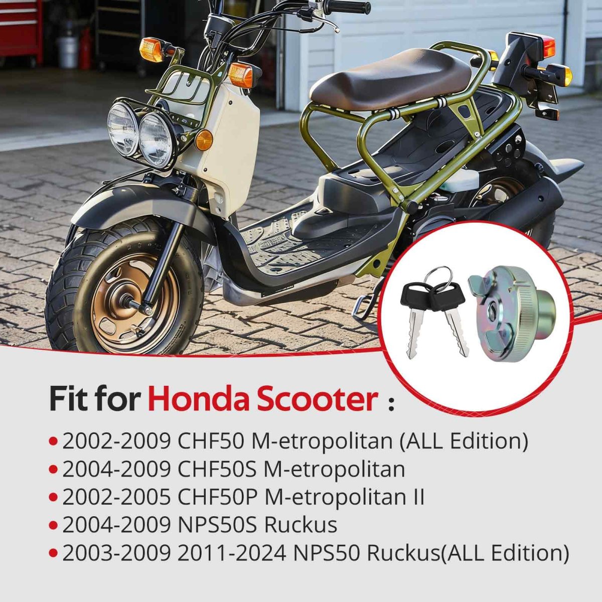Fitment: Fit For Honda Scooter 2002-2009 CHF50 M-etropolitan (ALL Edition); 2004-2009 CHF50S M-etropolitan; 2002-2005 CHF50P M-etropolitan II; 2004-2009 NPS50S R-uckus; 2003-2024 NPS50 R-uckus (2011-2024 ALL Edition). Feature: Well made and not easy to break. Fits without any modification, no leak and no bad smell. O.E.M# 17620-GEV-762 17620-GEZ-712. Package: Fuel Gas Tank Cap x1.Other fine products