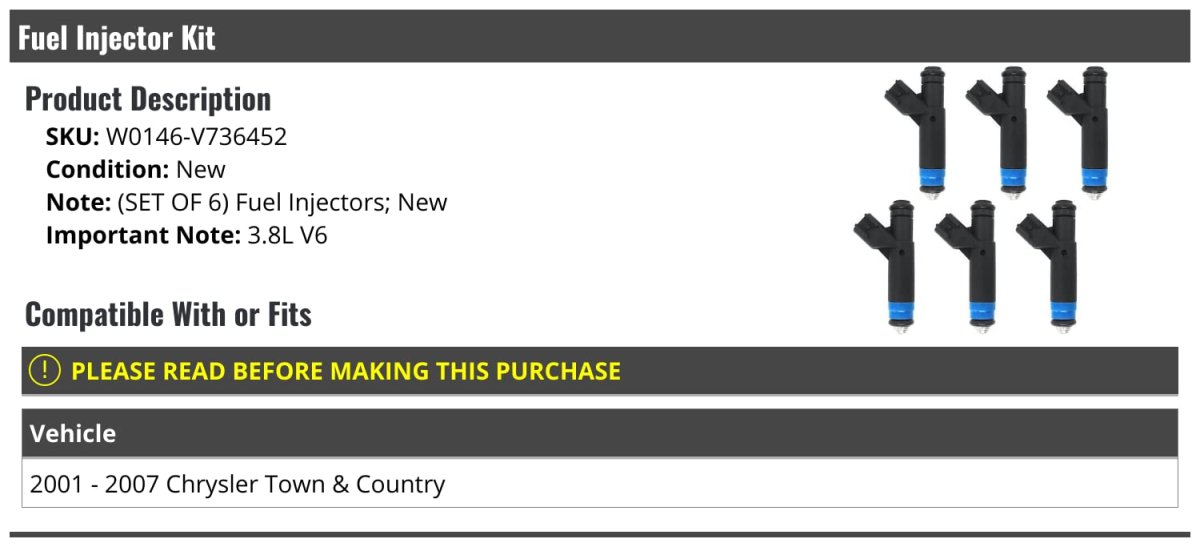 - Fuel Injector Kit 6 Piece For 2001-2007 Chrysler Town And Country 3 8l V6