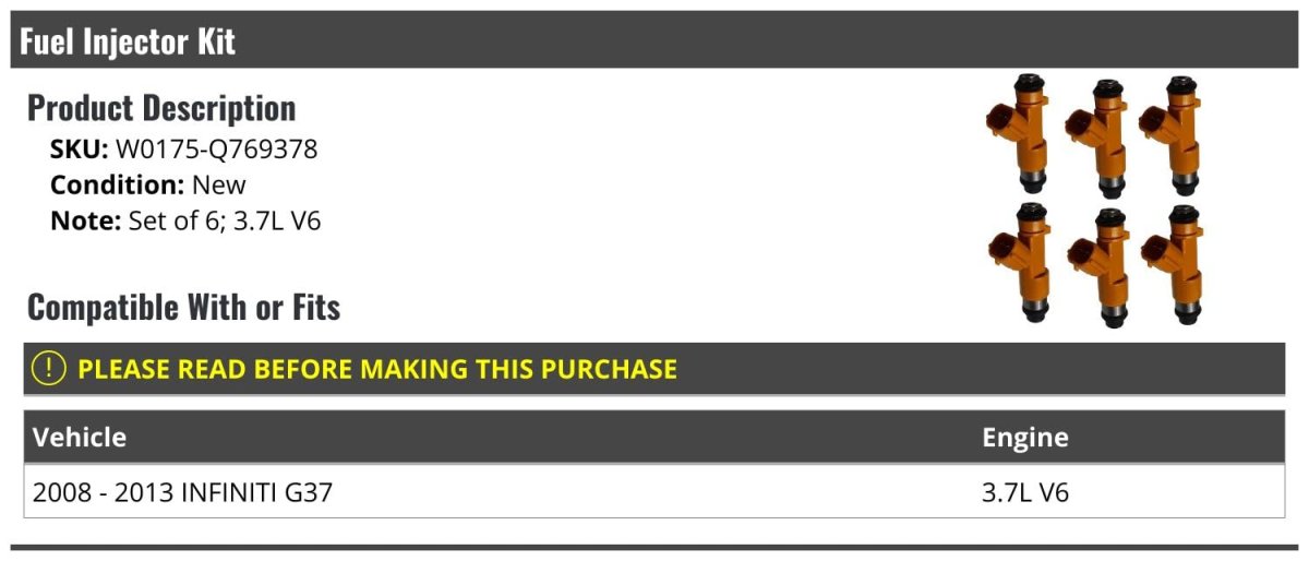 3.7L V6 Models. Compatible with or fits: 2008 - 2013 Infiniti G37 3.7L V6. (6) Fuel Injectors. Review Description to Ensure Proper Fit. OE Quality.