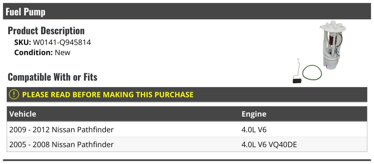Compatible with or fits: 2009 - 2012 Nissan Pathfinder 4.0L V6. Compatible with or fits: 2005 - 2008 Nissan Pathfinder 4.0L V6 VQ40DE. Review Description to Ensure Proper Fit. Fuel Pump. OE Quality.