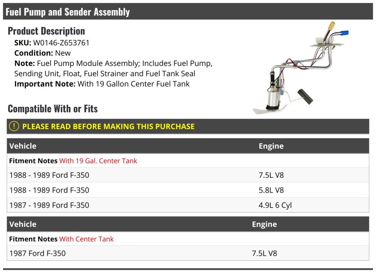 Fuel Pump Module Assembly; Includes Fuel Pump, Sending Unit, Float, Fuel Strainer and Fuel Tank Seal. With 19 Gallon Center Fuel Tank. Compatible with or fits: (Note: With 19 Gallon Center Tank; 1988 - 1989 Ford F-350 7.5L V8 1988 - 1989 Ford F-350 5.8L V8 1987 - 1989 Ford F-350 4.9L 6 Cyl) (Note: With Center Tank; 1987 Ford F-350 7.5L V8). Fuel Pump and Sender Assembly. Review Description to Ensure Proper Fit.Other fine products