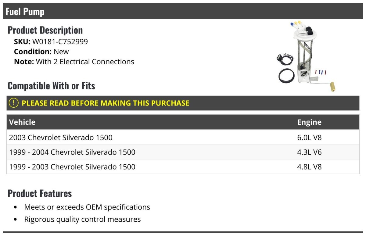 With 2 Electrical Connections. Compatible with or fits: 2003 Chevy Silverado 1500 6.0L V8 1999 - 2004 Chevy Silverado 1500 4.3L V6 1999 - 2003 Chevy Silverado 1500 4.8L V8. Meets or exceeds OEM specifications. Rigorous quality control measures. Fuel Pump.