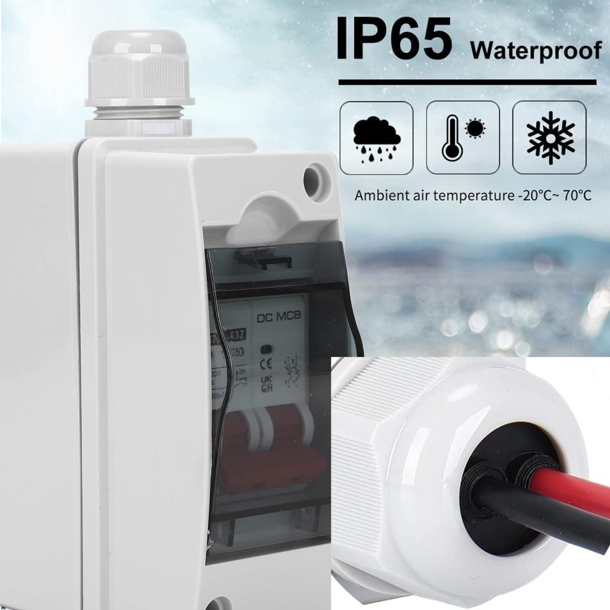 [Ip65] The dc isolator switch, ensuring safety even in rainy outdoor conditions.. [Wide Range of Uses] The dc miniature circuit breaker is suitable for 6 to 8.7mm diameter cables, making it versatile for various applications.. [Transparent Window Design] The upper cover features a transparent window for easy monitoring of the circuit breaker's operation status.. [Retardant] The pc dc circuit breaker is made of pa66, providing retardant and properties for enhanced safety.. [Versatile Application] for pv solar panel grid-connected systems, solar power generation, rvs, and more, this circuit breaker is a reliable choice..Other fine products