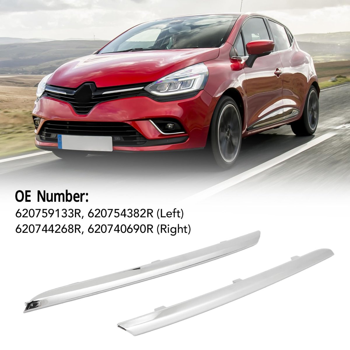[Easy Installation] Ensure this grille strip trim is compatible with your clio iv facelift 2016-2019 before purchasing to prevent returns.. [Oe Part Numbers] Reference oe numbers 620759133r, 620744268r for easy identification and fitment on the left and right sides.. [Stylish Design] Enhance the look of your vehicle with this grille strip cover that not only adds fashion but also protects against scratches and dirt.. [Durable & Reliable] Made to be sturdy and reliable, this trim insert can be easily installed without the need for special tools or complicated processes.. [Premium Material] Constructed with materials, this chrome finish trim adds style and elegant protection to your front bumper grille..