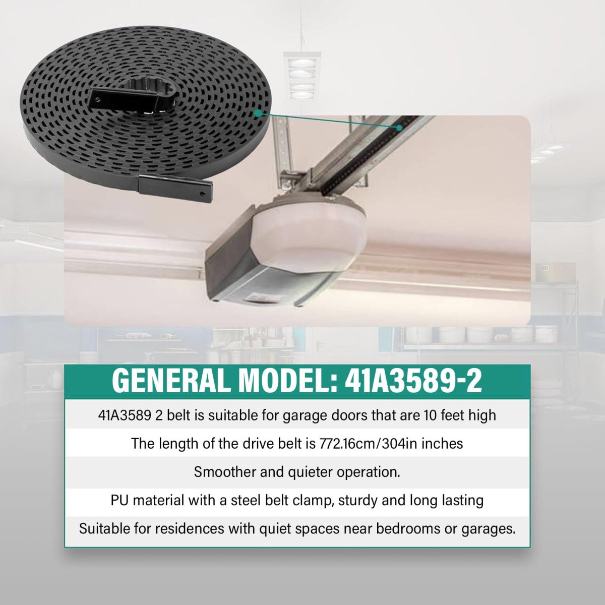 [Seamless Upgrade] : for chamberlain and for model, this belt seamlessly integrates with your garage door opener for easy installation and enhanced functionality.. [Durable & Reliable] : Crafted from polyurethane material with a strong steel belt Clamp/Holder, providing exceptional durability, reliability, and quiet operation.. [Fit] : The 41a3589-2 belt is tailor-made for 10-foot residential garage doors, ensuring a 304-inch length for optimal performance.. [Noise Reduction] : Featuring grooves every 6 inches, this innovative belt significantly reduces noise levels, great for quiet environments like bedrooms.. [Compatibility] : The 41a3589-2 belt is a versatile replacement option for chamberlain and for model, ensuring a reliable performance upgrade..Other fine products