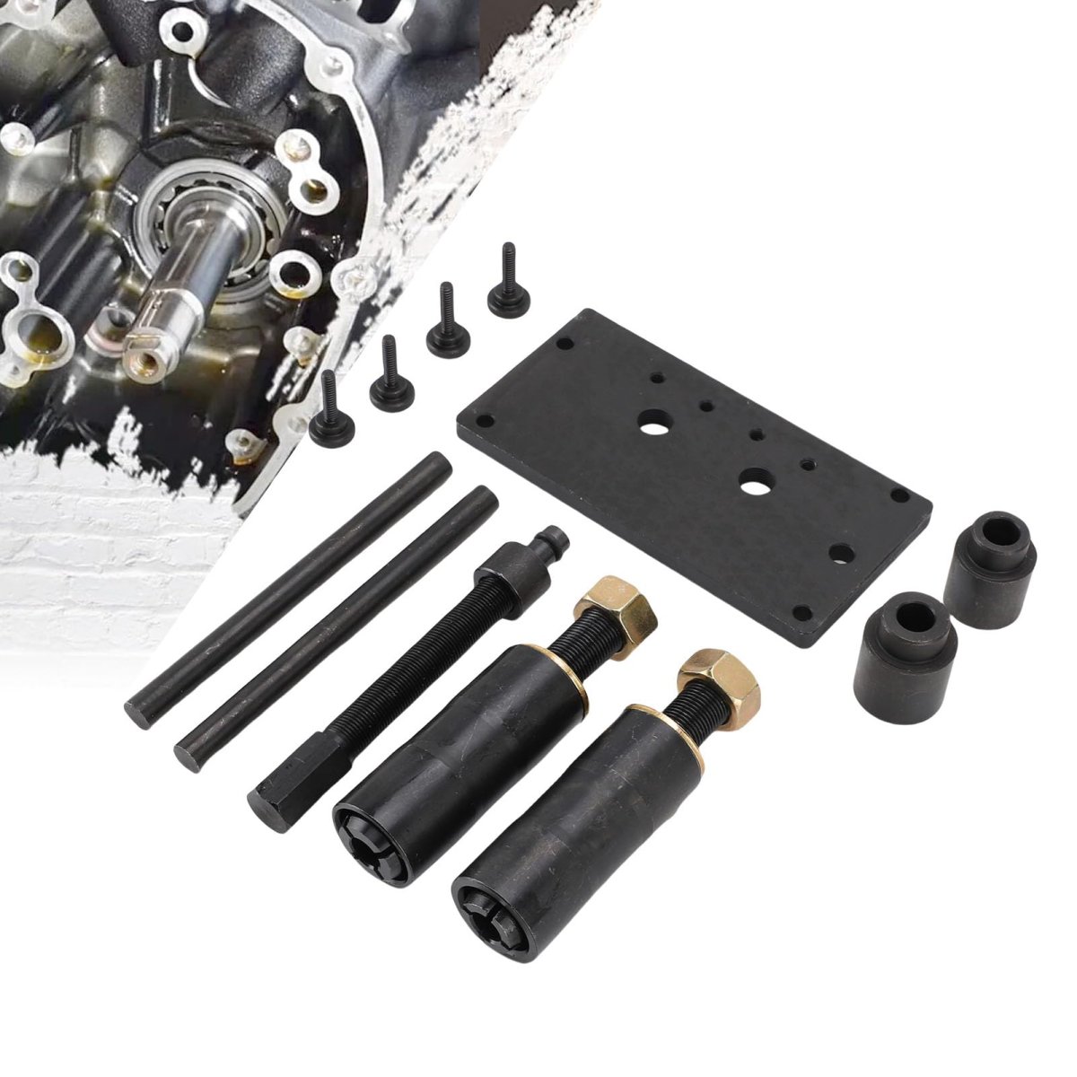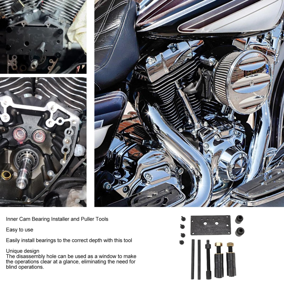 [Enhanced Visibility] A disassembly hole provides clear visibility during operations, eliminating blind manipulation for precision work.. [Complete Tool Kit] The kit includes 12 pieces such as a cam bearing plate, installer tools, and puller tools, offering a professional and dependable experience.. [Precise Bearing Installation] Install bearings to the correct depth with the bearing installer, while the bearing puller easily removes old bearings for efficient maintenance.. [Specifically Designed for Twin Cam ] This inner cam bearing installer puller ensures easy installation and removal of bearings for 88 93 96 103 110 twin cam .. [Robust Steel Construction] Made of durable steel, this tool set is to deformation and cracking for long-lasting use..Other fine products