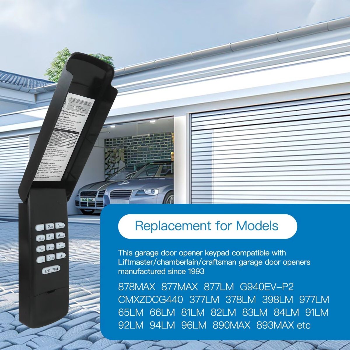 Product: Garage Door Opener Keypad Wireless Fit for LiftMaster 1240,1245, 1246, 1250, 1255, 1260, 1270, 1280, 1260LK, 1245LK, 1000SD, 2000SD, 215WD, 220WD, 315WD, 320WD, ATS211, 985, 1000SDR. Features: The keyless entry system controls up to 3 openers; different PIN can be used to match and control different garage door opener; Clamshell design and waterproof material extend the service life; backlit numbers are easy to read even in the dark. High Tech: This garage door keypad features the latest Security+ 2.0 rolling code technology that easily synchronizes with existing door opener frequencies to eliminate radio wave interference.Other fine products