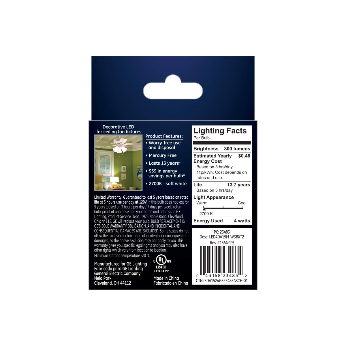 Dimmable 40-Watt replacement using only 4-Watts of energy. Rated to last over 13 years based on 3 hours per day use. Saves $59 in energy costs vs a 40-Watt incandescent ceiling fan A15 bulb over the bulbs life. Provides 300 lumens of light output and is same size as standard incandescent A15 Appliance Bulb. Soft White 2700K Color Temperature provides Warm, illuminating light.Other fine products
