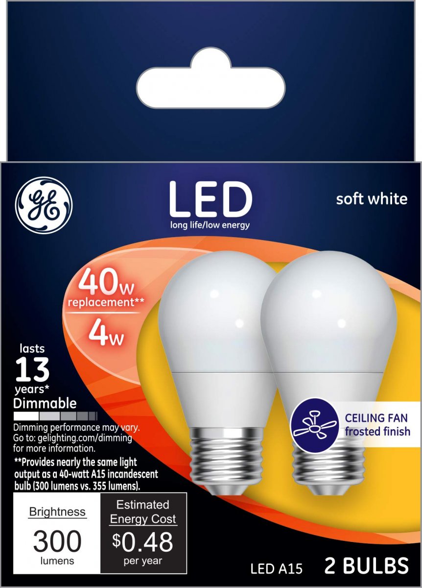 - Ge Lighting 23483 Light Dimmable Led A15 Ceiling Fan Bulb 4 40-watt-replacement 300-lumen Medium Base 2-pack Standard Frosted