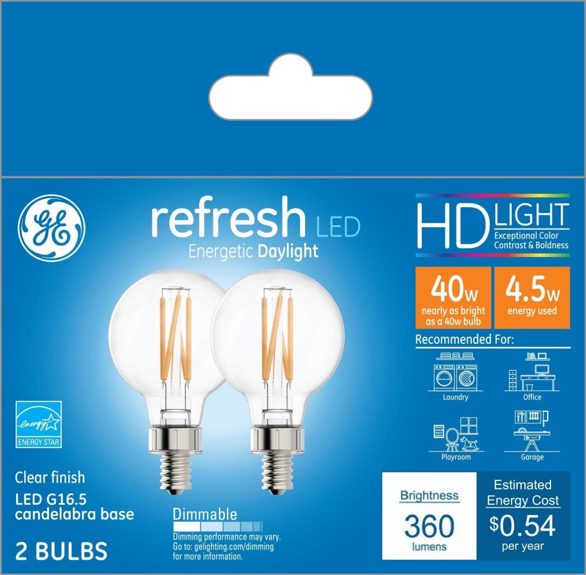 Enhanced Color: Refresh HD LED light bulbs offer a cool, invigorating light perfect for energizing moments and active spaces. Use Refresh HD LED light bulbs in playrooms, home offices, and laundry rooms.. LED Light Bulbs: The GE Refresh HD LED light bulbs are the perfect decorative, dimmable LED light bulbs that fit lamps, fixtures, and more.. Replacement Light Bulbs: These LED light bulbs replace traditional 40-Watt incandescent light bulbs while only using 4.5-Watts (350 lumens).. Long-Lasting: The LED light bulbs are rated to last 13 years based on 3 hours of daily use. These long-lasting GE globe LED bulbs will not disappoint.. Save Money: These LED lights save $58 on energy costs per light bulb versus a 40-Watt incandescent light bulb..Other fine products