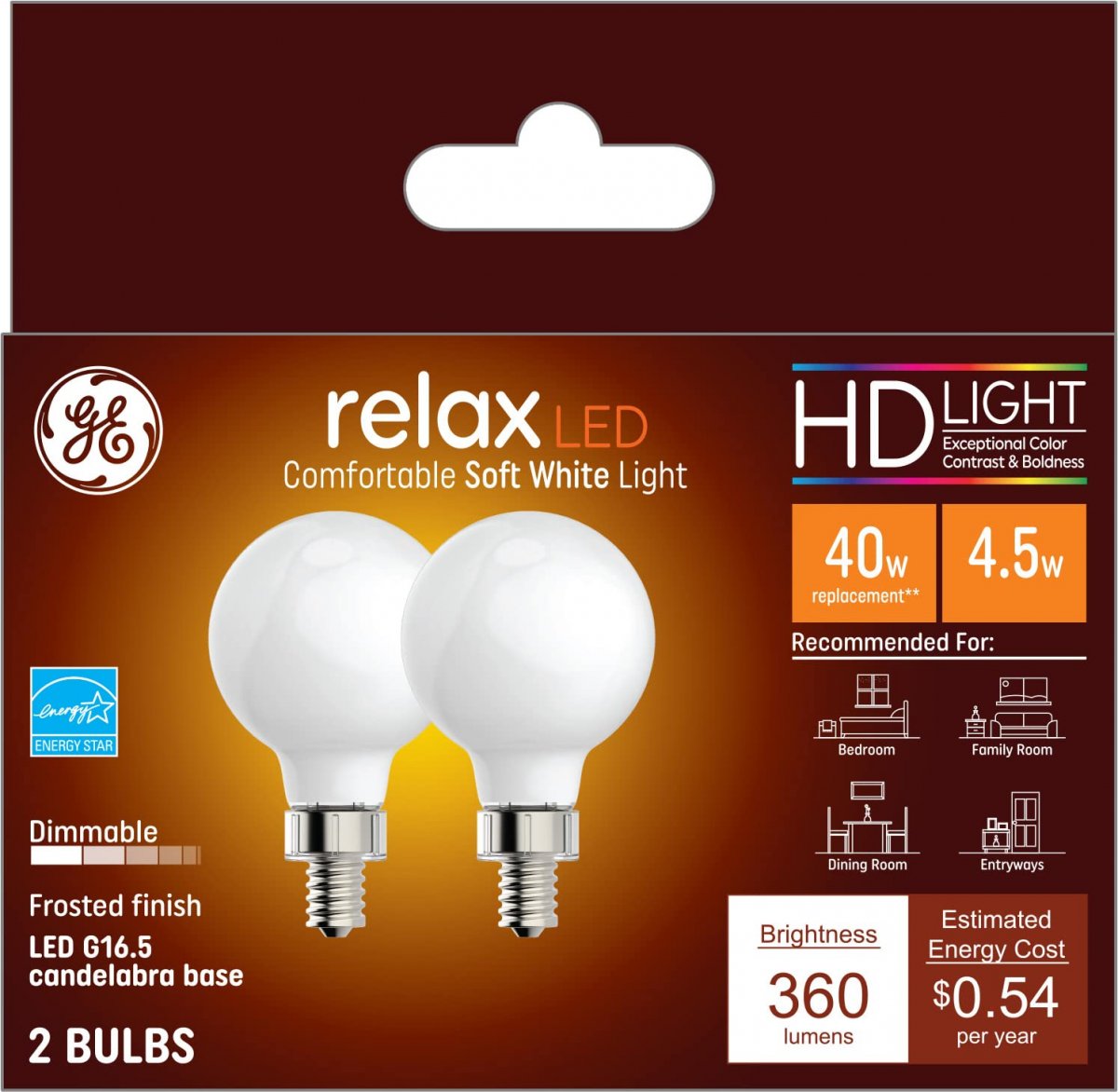 Enhanced Color: Relax HD LED light bulbs offer a warm, soft white light perfect for comfortable moments and cozy spaces. Use Relax HD LED light bulbs in spaces like bedrooms, family rooms, and dining rooms.. LED Light Bulbs: The GE Relax HD LED light bulbs are the perfect decorative, dimmable light bulbs that fit lamps, fixtures, and more.. Replacement Light Bulbs: These LED light bulbs replace traditional 40-Watt incandescent light bulbs while only using 4.5-Watts (350 lumens).. Long-Lasting: The LED light bulbs are rated to last 13 years based on 3 hours of daily use. These long-lasting GE globe LED bulbs will not disappoint.. Save Money: These LED light bulbs save $58 on energy costs per light bulb versus a 40-Watt incandescent light bulb..Other fine products