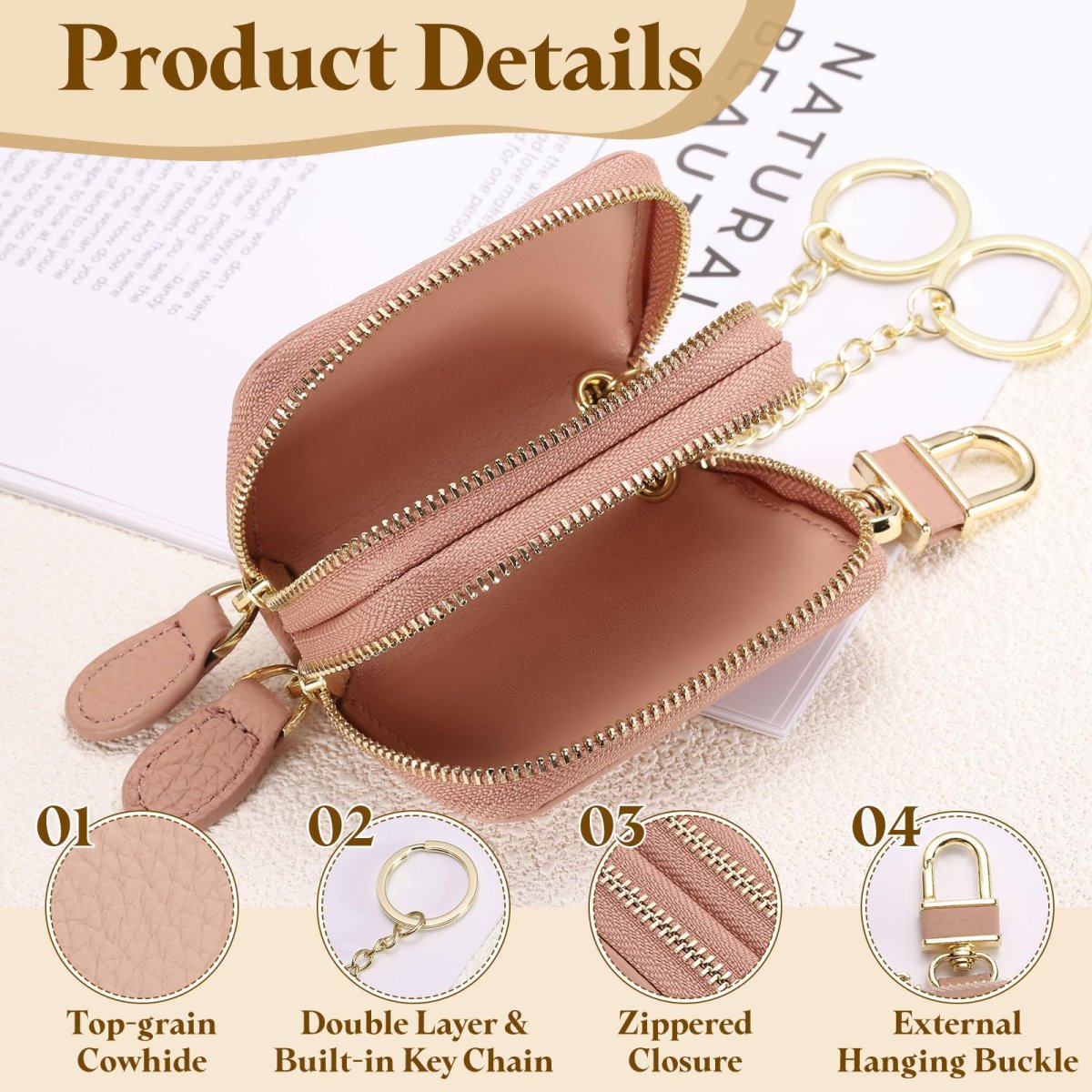 [Size & Package] - The car key bag features a total size of 8.5x5.3x3.5cm/3.35x2.09x1.38 inch (LxWxH), an inner pocket chain length of 7.5cm/2.95 inch, an inner pocket ring diameter of 3cm/1.18 inch, and the package includes 1 piece of car key bag.. [Durable Material] - The car key fob cover is crafted from top-grain cowhide on the exterior and lined with nylon on the interior, ensuring durability, water resistance, and wear resistance. The smooth texture and reinforced stitching contribute to its long-lasting use. [Protect Car Keys] - This zipper key case safeguards your remote control key from dirt and scratches. It includes a built-in key chain to secure the key, reducing the risk of loss or dropping. The external hanging buckle allows for easy attachment to a belt, offering added convenience. [Sufficient Storage Design] - Designed with ample space, this car key chain bag can comfortably hold car keys, house keys, or small items. The zippered closure ensures secure storage, making it easy to locate your keys when needed and eliminating the hassle of searching. [Practical Accessories] - Suitable for both men and women, this car key fob case meets daily storage needs and serves as a thoughtful gift option. Whether for everyday use, business travel, or outdoor activities, it combines functionality with a sleek design, enhancing practicality and organization.Other fine products