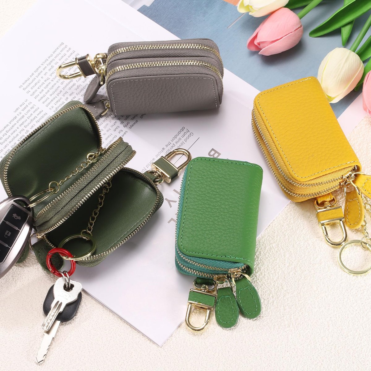 - Genuine Leather Car Key Fob Case Universal Holder Double Layer Zipper Bag For Men Women Pink