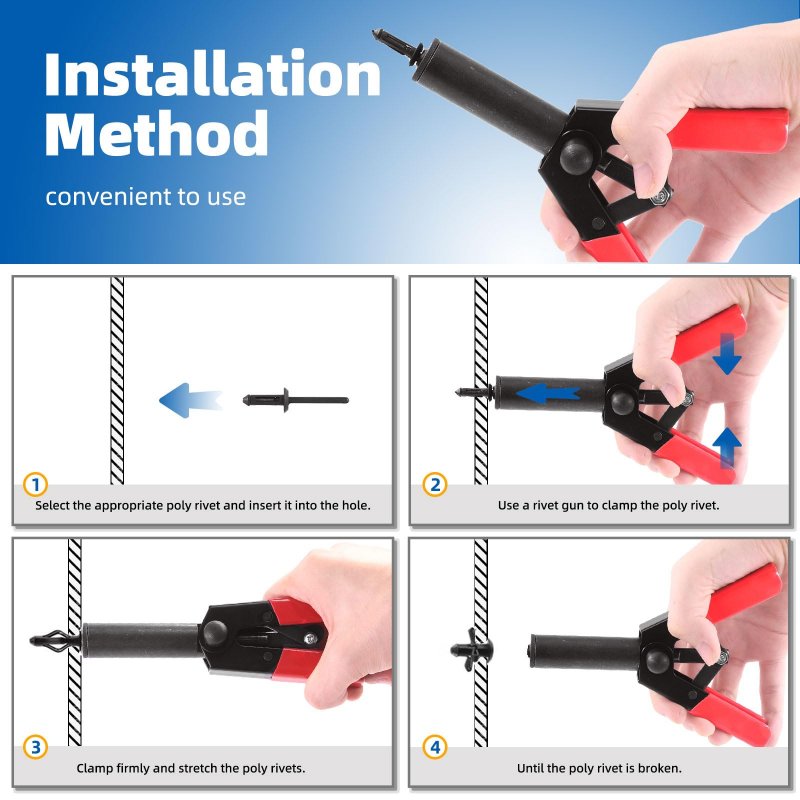 What You Get: In this set, you will receive 1pc rivet gun, 1pc fastener removal tool, 40pcs nylon universal pop rivets. Whats more, we also provide 4pcs pick and hook sets to you, they are all stored in a storage bag for you to find and use easily. A set of tools can meet all your needs, no need to spend money on other tools.. Ergonomically Designed Rivet Gun: The rivet gun with ergonomic design allows you to easily complete the operation with one hand, even in a narrow space without worrying about being unable to install or remove rivets. This riveter's self-adjusting jaws help set rivets perfectly in a single stroke, when use it and will not damage the paint or delicate surface.. Versatile Poly Rivet Gun Set: The rivet gun has a universal nose frame for plastic rivets of all sizes, you dont have to worry about the compatibility of the rivets. Fastener removal tool can safely remove metal or plastic clips. We also provide 4pcs pick and hooks to you, can meet all your different daily needs.. Product Features: The jaws of the rivet gun can automatically set the rivets perfectly in one stroke. Of course, you can also set all sizes of rivets by yourself without removing the nose and frame. It can effectively protect the surface of the car from damage.. Wide Application: The poly rivet gun set are widely used in cars, trucks, SUV, ATV and all vehicles to quickly release door panels and upholstery clips on your vehicle, For easy removal of door panel clips without causing damage..