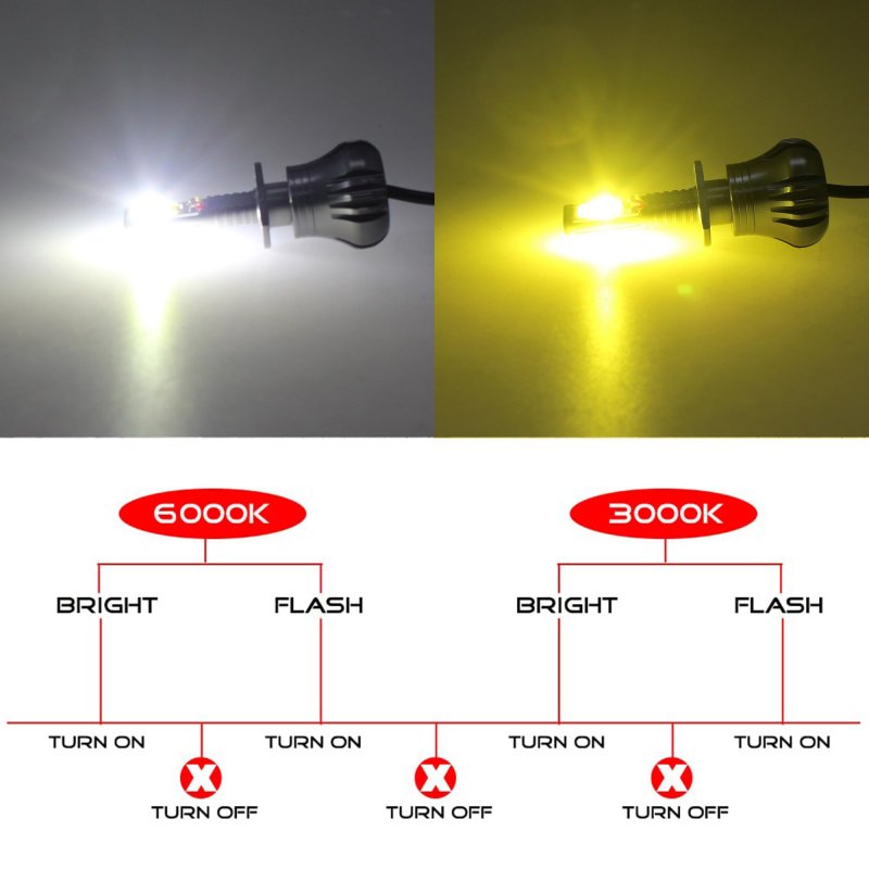 [Extremely Bright]2pcs high power & high brightness COB LED chips, 360 degree light output; Voltage: 12V-24V; Color:White & Yellow ; High illumination light output: 1200 lumens per.. [Stable Performance]Two lighting modes, light lasting luminous+blinking rapidly, Switch at any time.Built-in IC Circuit of wide and low voltage Range 12V to prevent LED Bulb from being damaged by voltage variation and spikes.. [Fitment]This bulbs are not recommended to be used as high or low beam , for it has no beam function, they are especially designed for fog lights/DRL use only.. [Easy Installation]Plug-and-play, non-polarity design makes installation easy. No extra wiring needed, installs in 10 minutes. CAN-bus may be needed for some vehicles..