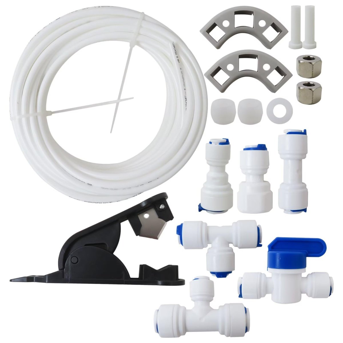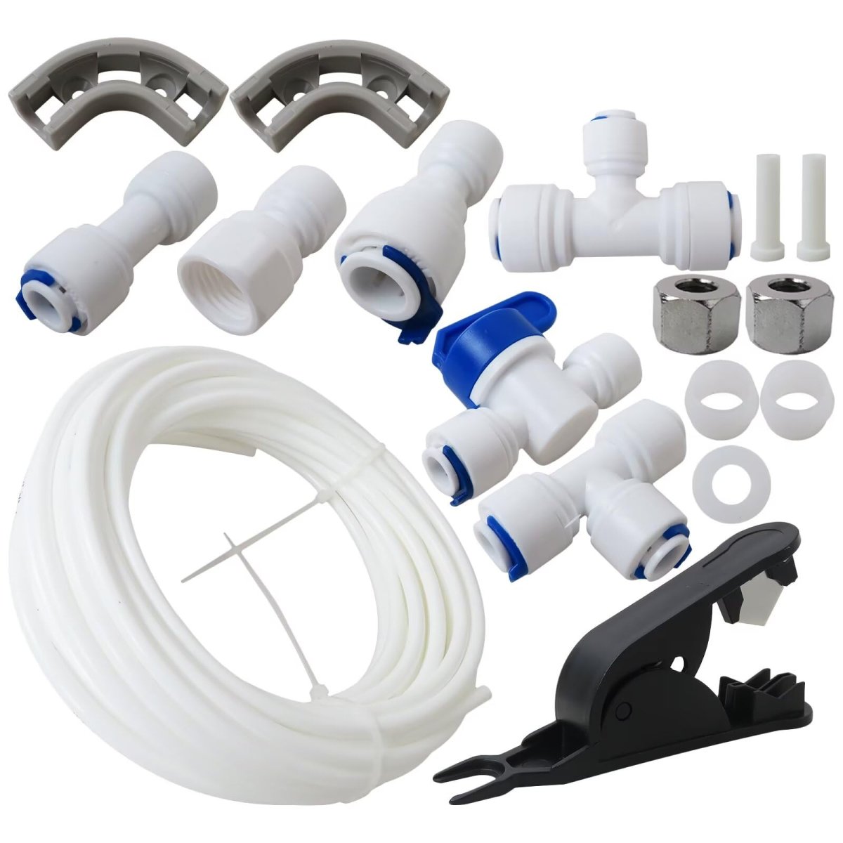 Wide Range of Applicable Our 1/4 fridge water line kit perfect for connecting under sink filtration system or reverse osmosis systems (1/4"or 3/8" Outlet) , and drinking water filter faucet, refrigerator, ice maker, water dispenser and more. Widely CompatibilityOur refrigerator water line kit is compatible with most brands and models of refrigerator such as for GE, for LG, for Whirlpool, for Samsung, for Frigidaire, etc. Superior Quality1/4 water line kit Specially designed for potable drinking water & refrigerator installations, the package includes enough accessories for all installation needs, Non-to-xic ingredients,Odorless and tasteless,Sturdy and easy to install. Effective Leakage Prevention Professional tube cutter and Push-in quick connect fittings offer easy DIY installation with no tools required.Fast and efficient cutting smooth, effectively avoiding leakage caused by uneven cuts. Easy InstallationThe 1/4 ice maker water line kit will work with any Reverse Osmosis system or filtration system, or it can be used alone.Other fine products