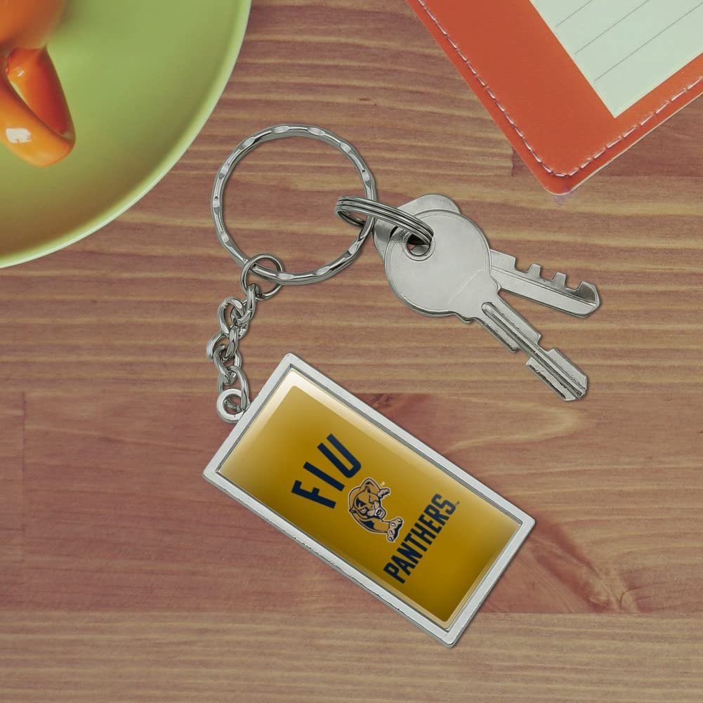 RECTANGLE KEYCHAIN - This Florida International Panthers Logo keychain will bring some flavor to your boring bundle of keys!. DURABLE RESIN-TOPPED DESIGN - The Florida International Panthers Logo design shown is resin-topped for durability.. QUALITY MATERIAL - This Florida International Panthers Logo keychain is made of metal with a chrome plated finish.. SIZE DETAILS - Made of chrome plated metal, and the rectangle is approximately 2.0" (5.1cm) x 1.0" (2.5cm) in size..Other fine products