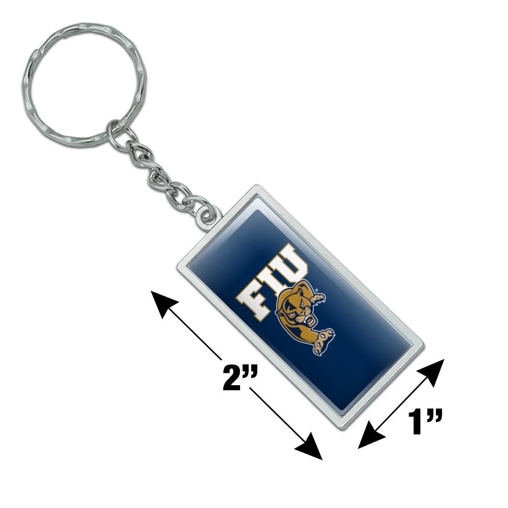 RECTANGLE KEYCHAIN - This Florida International University Primary Logo keychain will bring some flavor to your boring bundle of keys!. DURABLE RESIN-TOPPED DESIGN - The Florida International University Primary Logo design shown is resin-topped for durability.. QUALITY MATERIAL - This Florida International University Primary Logo keychain is made of metal with a chrome plated finish.. SIZE DETAILS - Made of chrome plated metal, and the rectangle is approximately 2.0" (5.1cm) x 1.0" (2.5cm) in size..