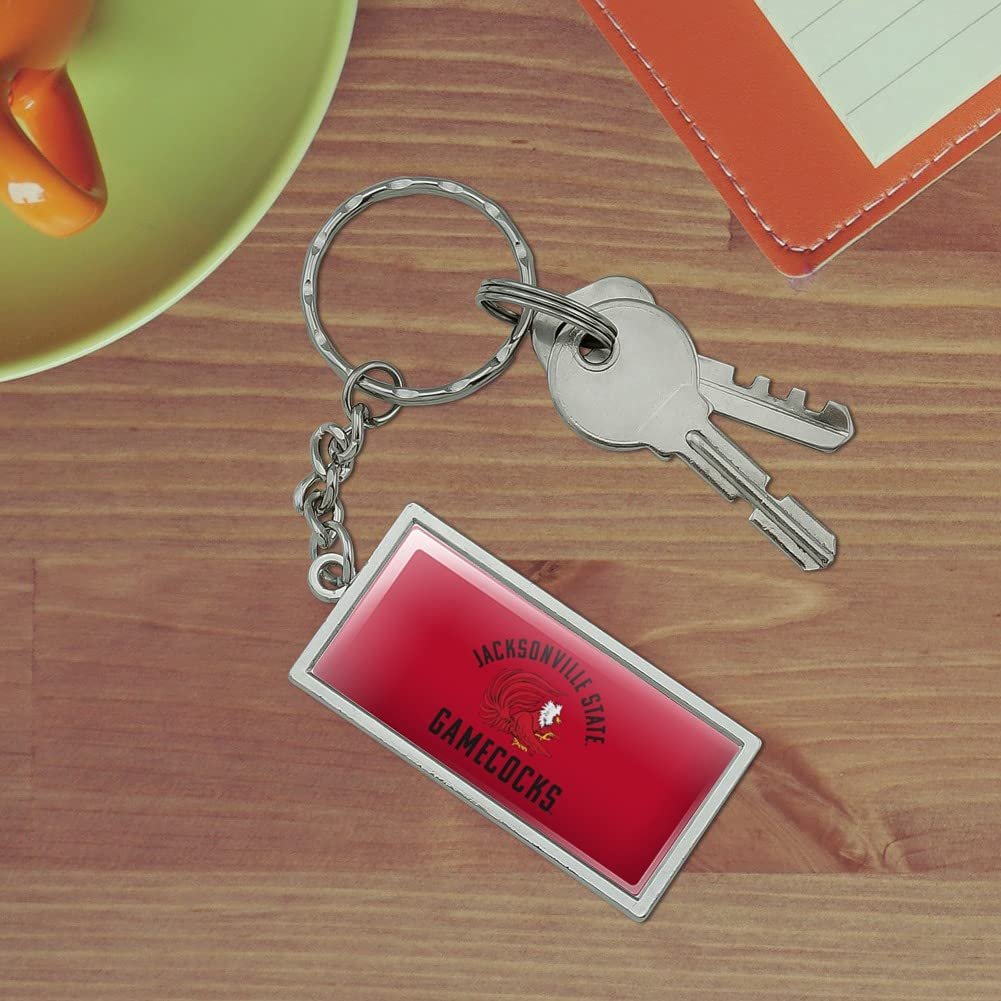 RECTANGLE KEYCHAIN - This Jacksonville State University Gamecocks keychain will bring some flavor to your boring bundle of keys!. DURABLE RESIN-TOPPED DESIGN - The Jacksonville State University Gamecocks design shown is resin-topped for durability.. QUALITY MATERIAL - This Jacksonville State University Gamecocks keychain is made of metal with a chrome plated finish.. SIZE DETAILS - Made of chrome plated metal, and the rectangle is approximately 2.0" (5.1cm) x 1.0" (2.5cm) in size..Other fine products