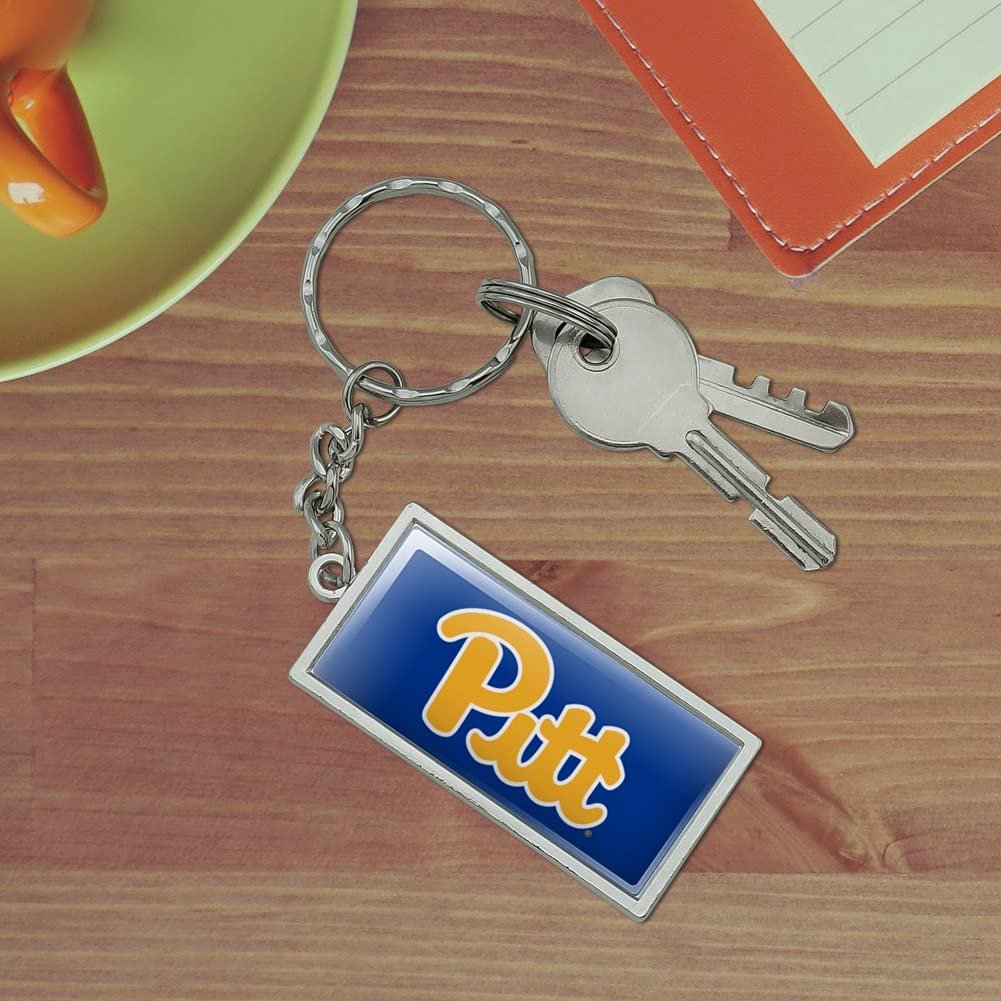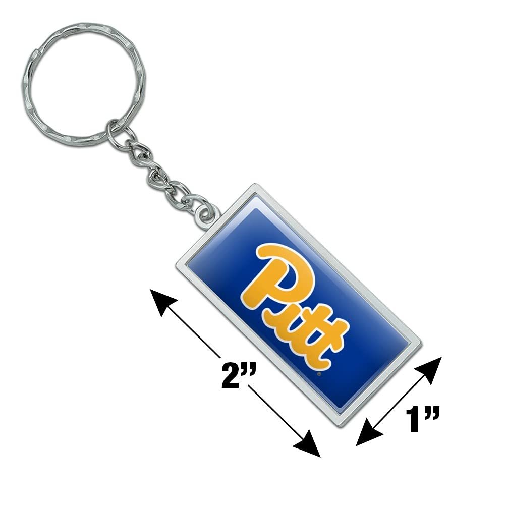 RECTANGLE KEYCHAIN - This University of Pittsburgh Primary Logo keychain will bring some flavor to your boring bundle of keys!. DURABLE RESIN-TOPPED DESIGN - The University of Pittsburgh Primary Logo design shown is resin-topped for durability.. QUALITY MATERIAL - This University of Pittsburgh Primary Logo keychain is made of metal with a chrome plated finish.. SIZE DETAILS - Made of chrome plated metal, and the rectangle is approximately 2.0" (5.1cm) x 1.0" (2.5cm) in size..Other fine products