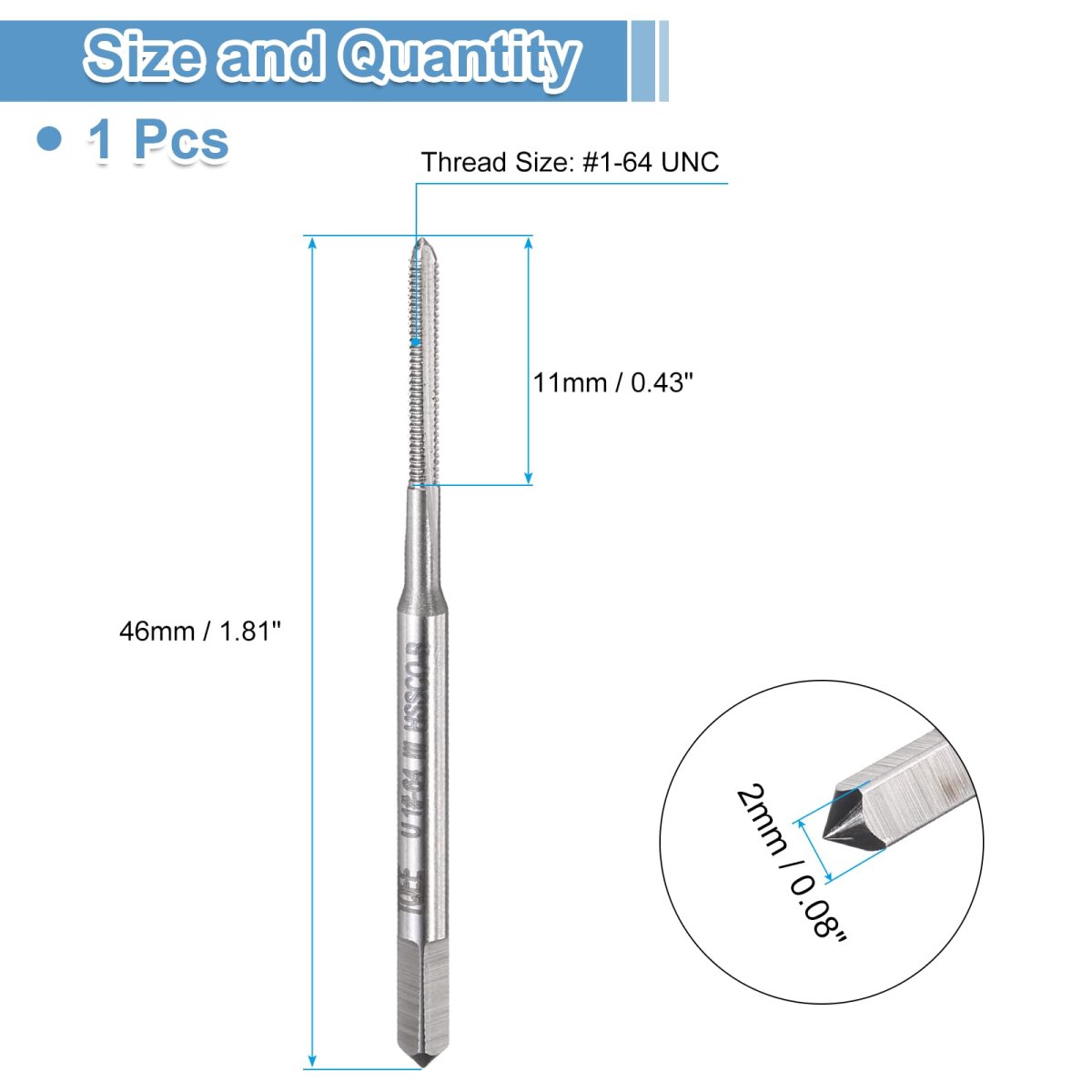 Hand Threading Tap Size: Thread size: #1-64 UNC; total length: 46mm / 1.81"; thread length: 11mm / 0.43"; square end width: 2mm / 0.08"; accuracy class: 2B. Right hand thread cutting, fast tapping with accuracy.. Bottoming Style Tap: Bottom tap generates threads close to the bottom of a hole. The straight groove design of the hand tap can quickly remove chips downward, reduce operating resistance, and achieve efficient processing. The thread is clear and burr-free, which can achieve precise tapping.. Wide Applications: Hand taps are mainly used with tap wrenches and are suitable for re-tapping damaged or stuck threads, or to create new threads. The threading tools are used for tapping through or shallow holes in mild steels, aluminum, iron, copper, hard plastic.. M2 (6542) High Speed Steel: It has high hardness, good wear resistance, is not easy to deform, heat-resistant and has a long service life. It is characterized by only a matrix without any coating, and is suitable for general thread tapping.. Tips: Add appropriate tapping oil for higher quality internal threads and more durable screw taps. Ensure proper alignment, use proper tapping technique, and apply consistent pressure as you turn the tap to achieve clean, precise threads. Periodically reverse while tapping to break up chips and remove debris from the flutes.Other fine products