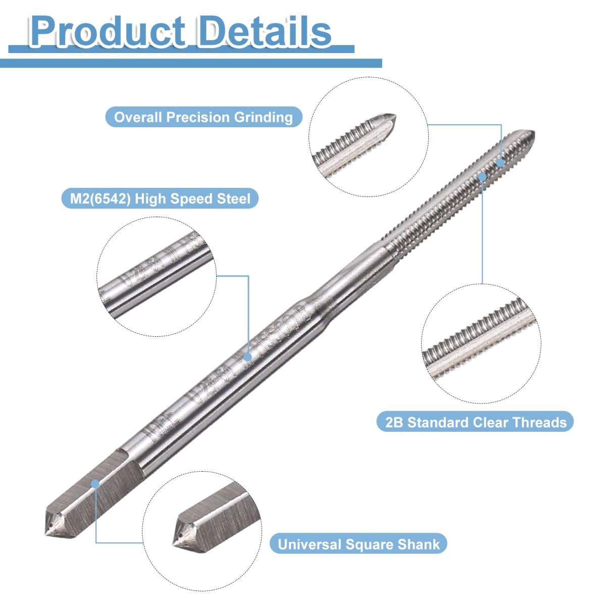 Hand Threading Tap Size: Thread size: #2-64 UNF; total length: 44mm / 1.73"; thread length: 10mm / 0.39"; square end width: 2.7mm / 0.11"; accuracy class: 2B. Right hand thread cutting, fast tapping with accuracy.. Bottoming Style Tap: Bottom tap generates threads close to the bottom of a hole. The straight groove design of the hand tap can quickly remove chips downward, reduce operating resistance, and achieve efficient processing. The thread is clear and burr-free, which can achieve precise tapping.. Wide Applications: Hand taps are mainly used with tap wrenches and are suitable for re-tapping damaged or stuck threads, or to create new threads. The threading tools are used for tapping through or shallow holes in mild steels, aluminum, iron, copper, hard plastic.. M2 (6542) High Speed Steel: It has high hardness, good wear resistance, is not easy to deform, heat-resistant and has a long service life. It is characterized by only a matrix without any coating, and is suitable for general thread tapping.. Tips: Add appropriate tapping oil for higher quality internal threads and more durable screw taps. Ensure proper alignment, use proper tapping technique, and apply consistent pressure as you turn the tap to achieve clean, precise threads. Periodically reverse while tapping to break up chips and remove debris from the flutes.Other fine products
