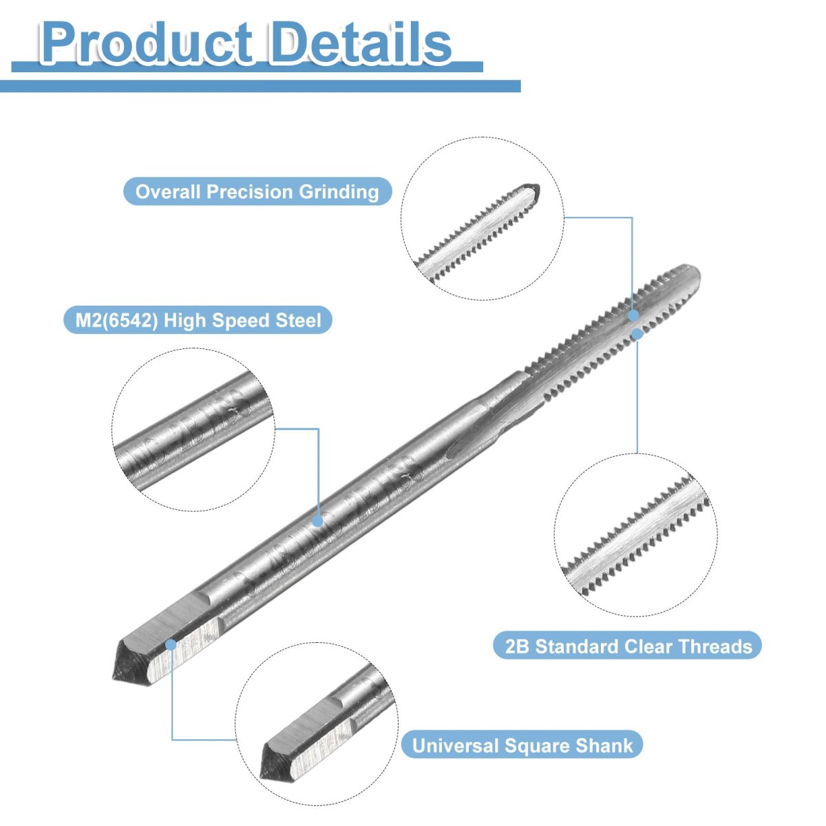 Hand Threading Tap Size: Thread size: #3-48 UNC; total length: 45.6mm / 1.80"; thread length: 13mm / 0.51"; square end width: 2.5mm / 0.10"; accuracy class: 2B. Right hand thread cutting, fast tapping with accuracy.. Bottoming Style Tap: Bottom tap generates threads close to the bottom of a hole. The straight groove design of the hand tap can quickly remove chips downward, reduce operating resistance, and achieve efficient processing. The thread is clear and burr-free, which can achieve precise tapping.. Wide Applications: Hand taps are mainly used with tap wrenches and are suitable for re-tapping damaged or stuck threads, or to create new threads. The threading tools are used for tapping through or shallow holes in mild steels, aluminum, iron, copper, hard plastic.. M2 (6542) High Speed Steel: It has high hardness, good wear resistance, is not easy to deform, heat-resistant and has a long service life. It is characterized by only a matrix without any coating, and is suitable for general thread tapping.. Tips: Add appropriate tapping oil for higher quality internal threads and more durable screw taps. Ensure proper alignment, use proper tapping technique, and apply consistent pressure as you turn the tap to achieve clean, precise threads. Periodically reverse while tapping to break up chips and remove debris from the flutes.