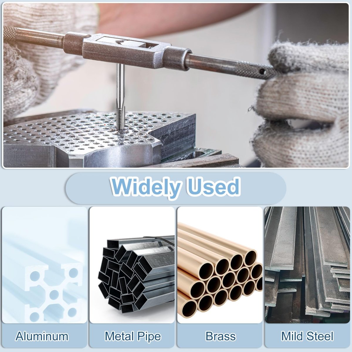 Hand Threading Tap Size: Thread size: 5/16-18 UNC; total length: 71mm / 2.80"; thread length: 21mm / 0.83"; square end width: 5mm / 0.20"; accuracy class: 2B. Right hand thread cutting, fast tapping with accuracy.. Bottoming Style Tap: Bottom tap generates threads close to the bottom of a hole. The straight groove design of the hand tap can quickly remove chips downward, reduce operating resistance, and achieve efficient processing. The thread is clear and burr-free, which can achieve precise tapping.. Wide Applications: Hand taps are mainly used with tap wrenches and are suitable for re-tapping damaged or stuck threads, or to create new threads. The threading tools are used for tapping through or shallow holes in mild steels, aluminum, iron, copper, hard plastic.. M2 (6542) High Speed Steel: It has high hardness, good wear resistance, is not easy to deform, heat-resistant and has a long service life. It is characterized by only a matrix without any coating, and is suitable for general thread tapping.. Tips: Add appropriate tapping oil for higher quality internal threads and more durable screw taps. Ensure proper alignment, use proper tapping technique, and apply consistent pressure as you turn the tap to achieve clean, precise threads. Periodically reverse while tapping to break up chips and remove debris from the flutes.