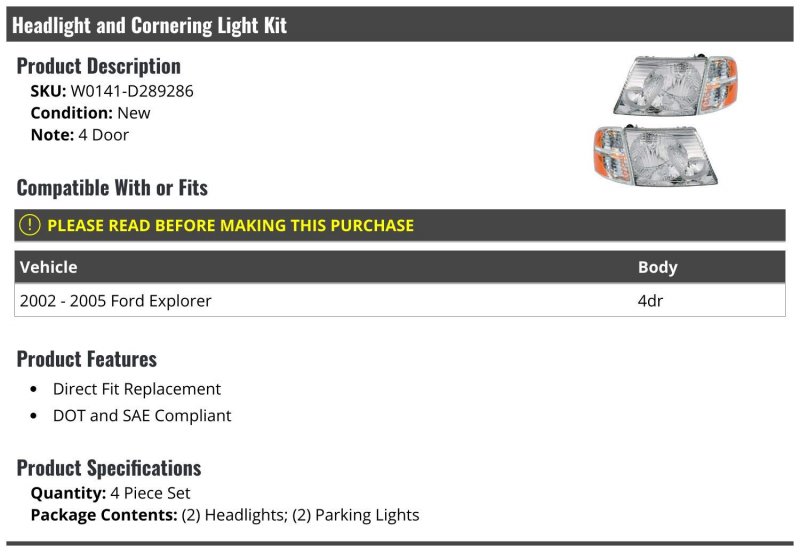 - Headlight And Cornering Light Kit 4 Piece Compatible With 2002-2005 Ford Explorer 4-door