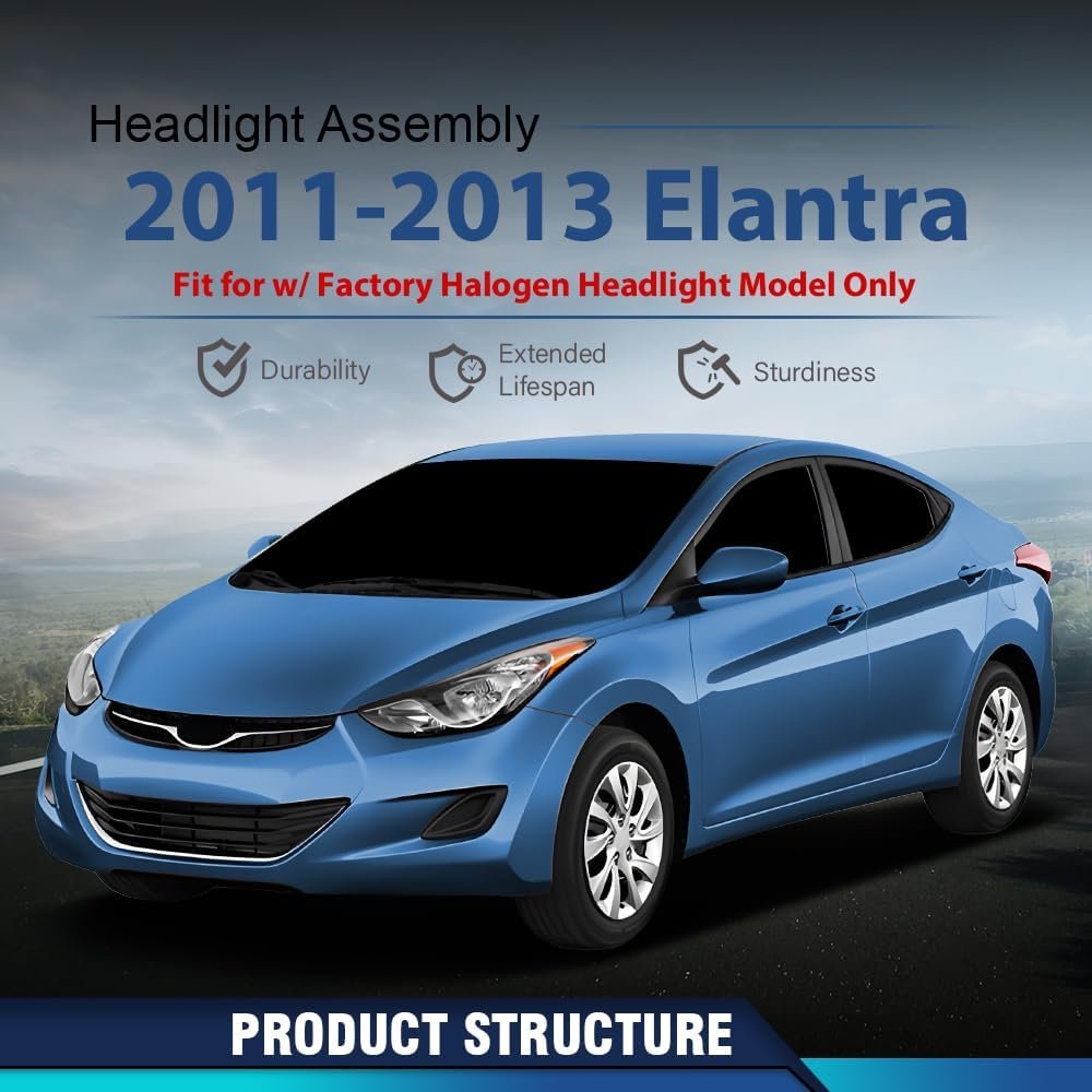 - Headlight Assembly Front Headlamp Left Side For Hyundai Elantra 2011 2012 2013 Fit W Factory Halogen Model Only Clear Lens