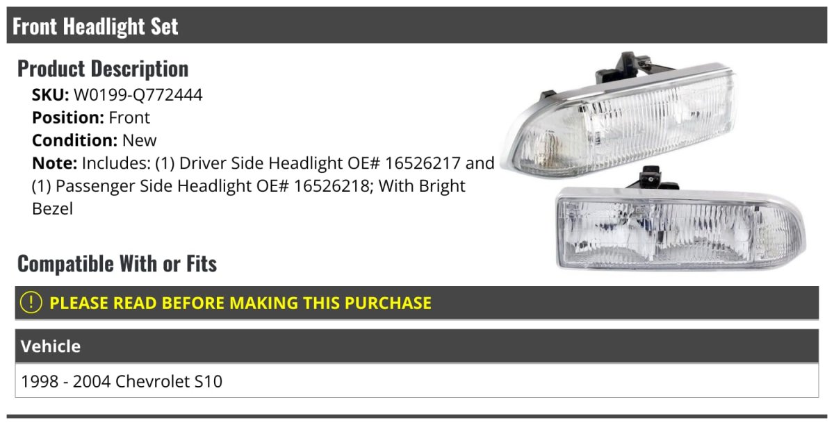 Includes: (1) Driver Side Headlight OE# 16526217 and (1) Passenger Side Headlight OE# 16526218; With Bright Bezel. Compatible with or fits: 1998 - 2004 Chevrolet S10. Front Headlight Set. Review Description to Ensure Proper Fit. Direct Fit.