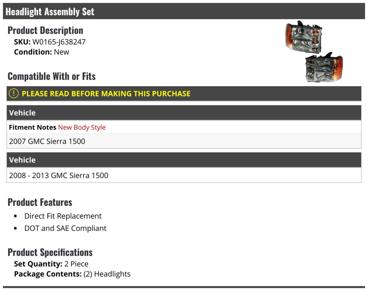 - Headlight Assembly Set Of 2 For 2007-2013 Gmc Sierra 1500