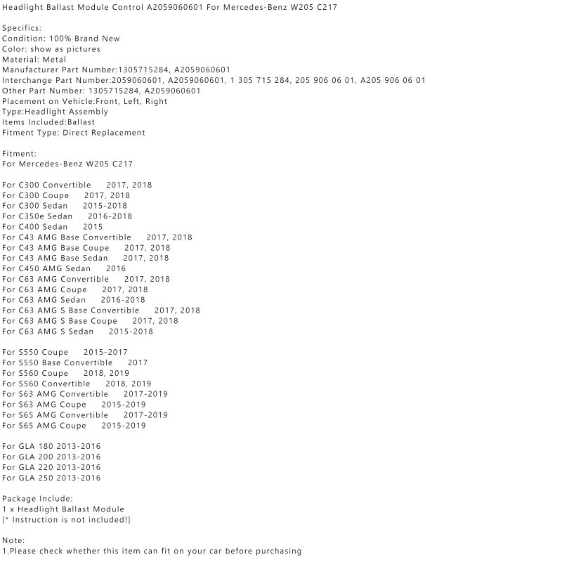 - Headlight Ballast Module Control A2059060601 For Benz W205 C217 C300 Convertible 2017-2018 Sedan 2015-2018 C63 Amg S S65 Coupe