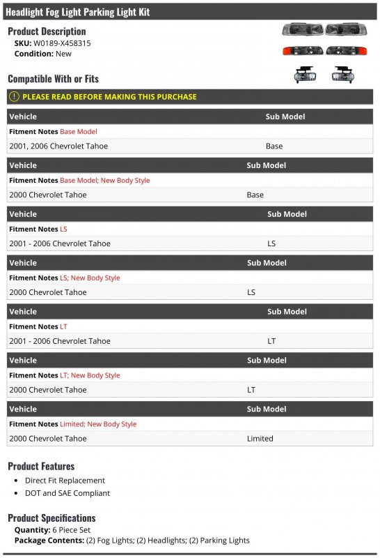 Compatible with or fits: (Note: Base Model; 2001, 2006 Chevy Tahoe Base) (Note: Base Model; New Body Style; 2000 Chevy Tahoe Base) (Note: LS; 2001 - 2006 Chevy Tahoe LS) (Note: LS; New Body Style; 2000 Chevy Tahoe LS) (Note: LT; 2001 - 2006 Chevy Tahoe LT) (Note: LT; New Body Style; 2000 Chevy Tahoe LT) (Note: Limited; New Body Style; 2000 Chevy Tahoe Limited). Direct Fit Replacement. DOT and SAE Compliant. Quantity: 6 Piece Set; Package Contents: (2) Fog Lights; (2) Headlights; (2) Parking Lights. Headlight Fog Light Parking Light Kit.Other fine products