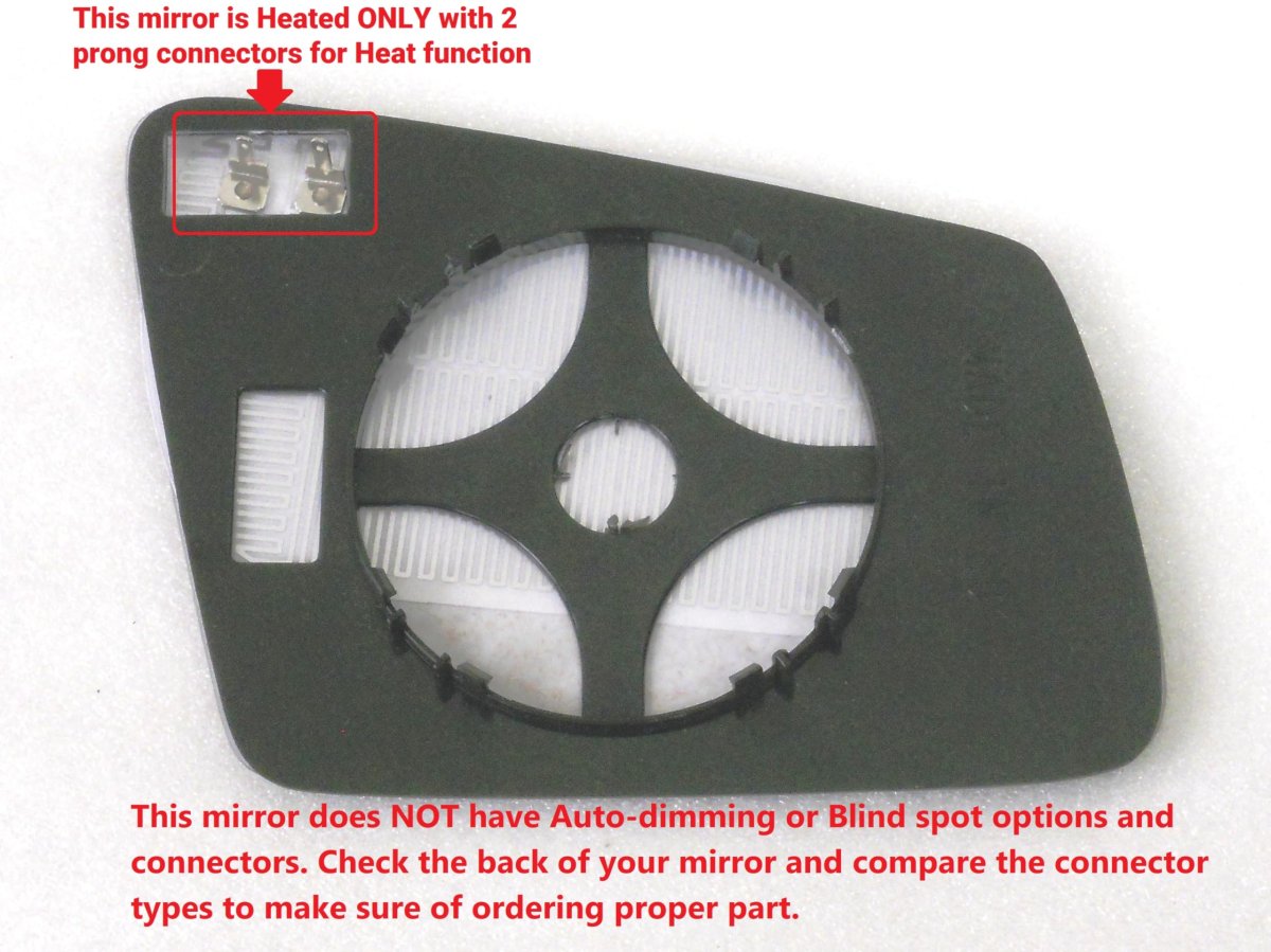 Heated Mirror With Backing Plate - Clips on the motor Mount - Does NOT have optional Blind Spot or Auto-Dimming features - Check picture that shows back of the glass and compare to yours. Diagonal Measure (Longest): 7 7/8 inch = 20.0 cm. Longest diagonal dimension provided is the longest size of the glass in any direction, normally longest top to opposite bottom corners measuremen. Check clips position and connector type in picture. Easily clips on motor, no glue needed. Complete with heat grid and not a stick on glass. Aluminum back coated real mirror glass for automotive application. This feature is in contrast with glasses with chrome paint spray film on top that look like mirror but top chrome spray fades or scratches over short time..Other fine products
