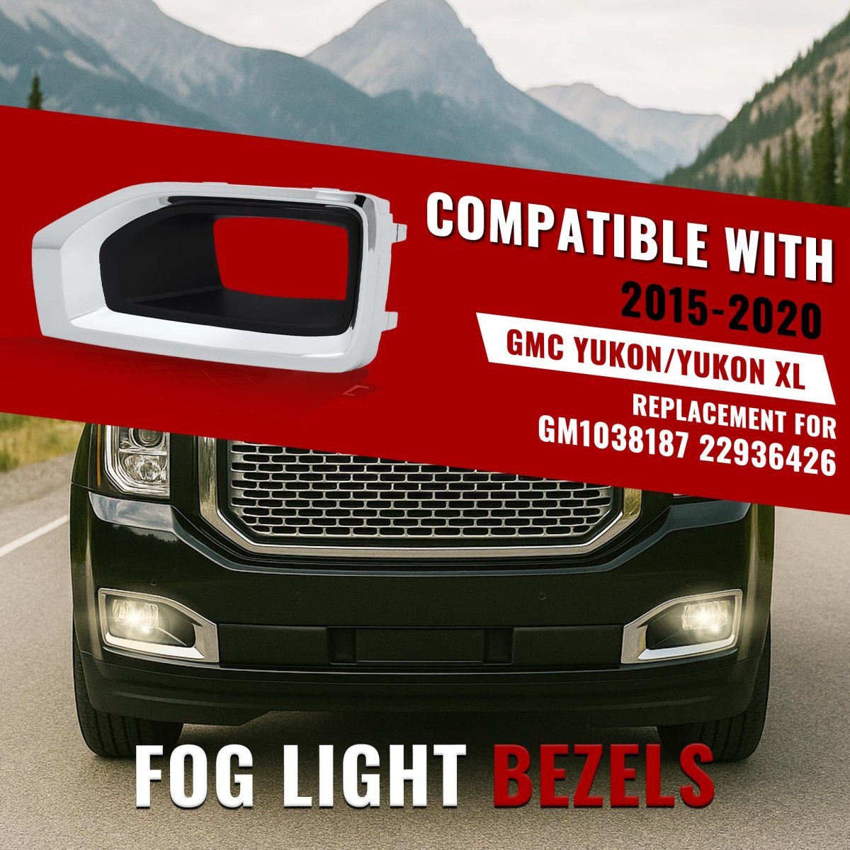 Fitment: Fog light bezels compatible with 2015-2020 GMC Yukon, compatible with 2015-2020 GMC Yukon XL. Replacement for GM1038187 22936426. Function: The fog lamp bezels feature a sleek and modern design with a glossy black finish that harmonizes with the vehicle's appearance, boosting its visual appeal. Additionally, they shield the fog lights from scratches due to stones or branches, thereby increasing their longevity and resilience. Feature: Material: Plastic (PP+ABS). Color:Black+Silvery. Position: Driver side. Made of premium plastic, make it sturdy and durable, able to withstand harsh weather and conditions. Package: You will receive 1 left driver side fog lamp bezel. No installation accessories and installation manual. Installation: Designed for a direct replacement. Just replacement your damaged fog light bezels, easy and convenient. You can easily install it by yourself in a very short time.Other fine products