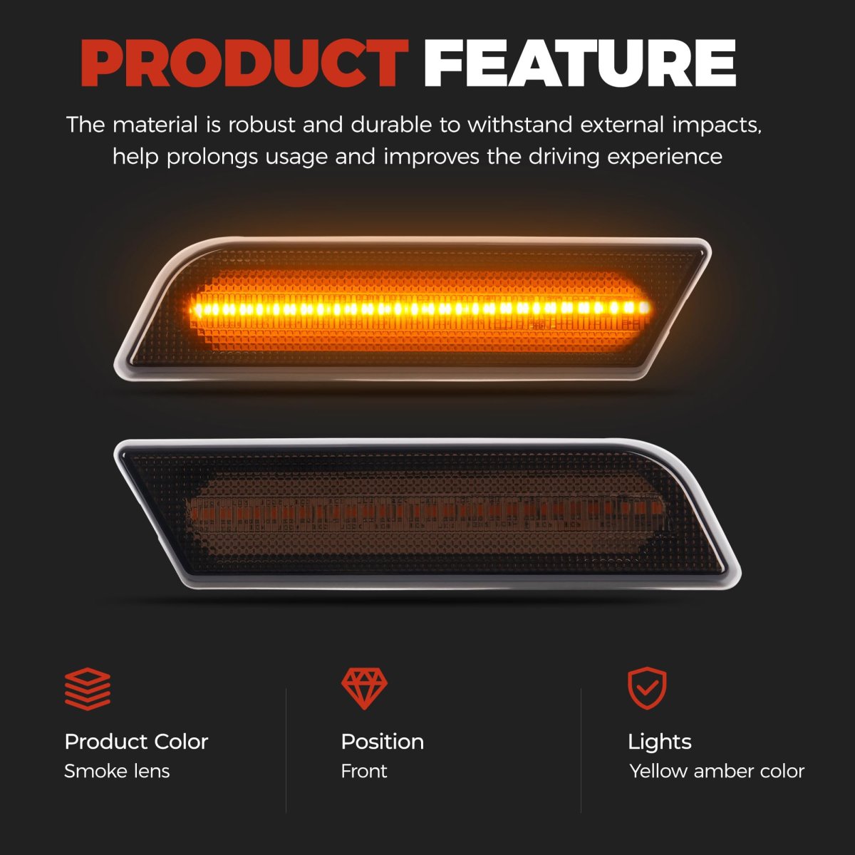 Feature: Material: Plastic. Color: Smoke lens. Position: Front. The lights have a yellow amber light. The material is robust and durable to withstand external impacts, help prolongs usage and improves the driving experience. Function: The LED side marker lights improve the visibility of the driver's field of vision, providing good visibility day or night, even in bad weather. Vehicles around you can easily notice you, make them react in a very short time, reduce road traffic risks. Installation: Designed for a simple and quick installation. Just replace your damaged or outdated side marker lights directly, easy and convenient. Package: You will receive 2 pcs amber front LED side marker lights. All the lights are smoke lens. Mounting accessories and installation instructions are not included.Other fine products
