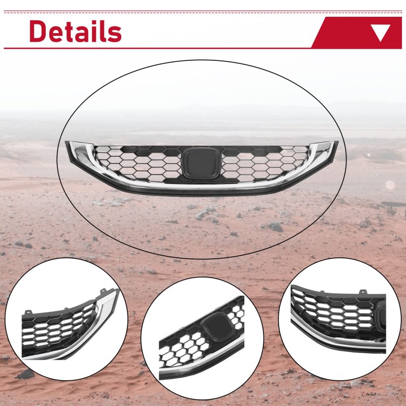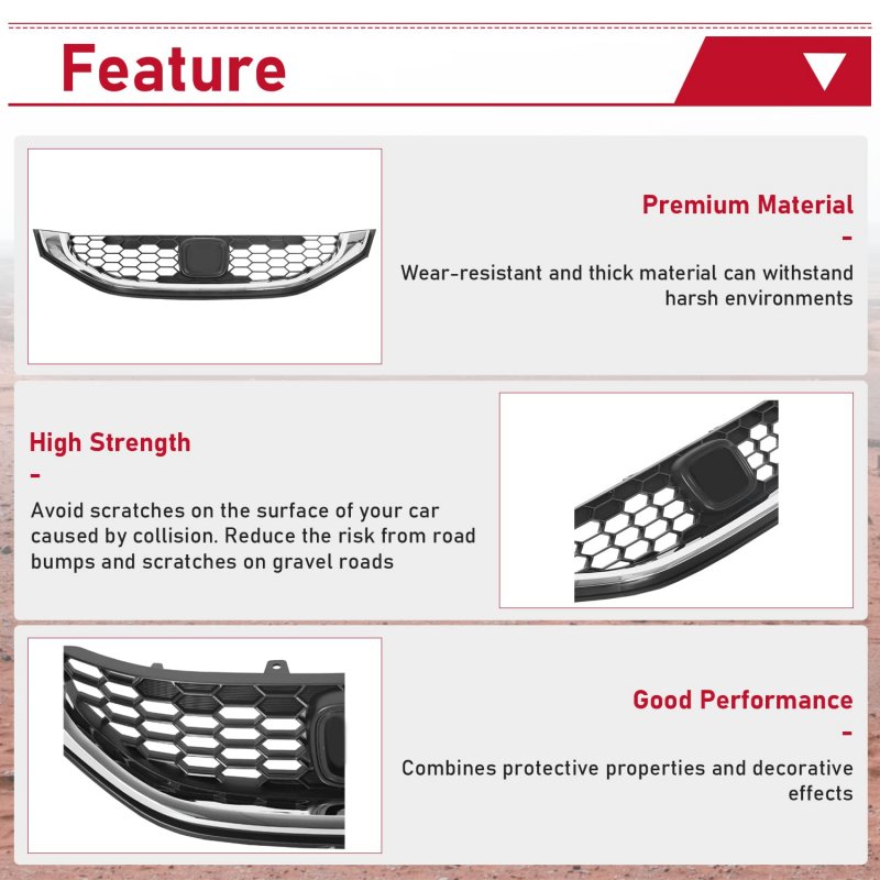 Fitment: Compatible with 2013-2015 Honda Civic Sedan 1.8 liter engine LX/HF/CNG(Natural Gas) Models.. Part Number: Replacement for 71121TR3A01, HO1200216 (Grille) 71122TR3A01, HO1202109 (Molding).. Feature: Color: Black + Chrome; Material: Made of ABS plastic, solid and durable.. Function: The grille is not only a core component of your vehicle, it also prevents debris and harmful substances from damaging radiators, while allowing air to pass through and keeping the engine cool. In addition, the grille gives your vehicle a handsome looking and makes your car stand out from the crowds.. Package Included: One Front Bumper Grille. Instruction is not included!!! Easy to install, directly replacement..Other fine products
