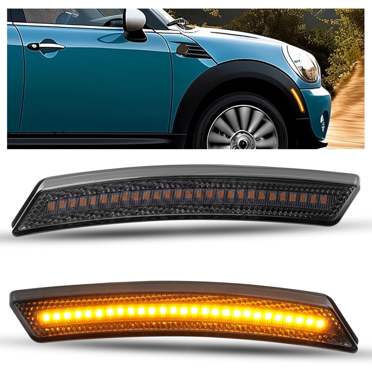 Fitment: The Side marker light compatible with 2008-2014 Mini Cooper R55 Clubman/2007-2013 Mini Cooper R56 Hatch/2009-2015 Mini Cooper R57 Convertible/2012-2015 Mini Cooper R58 Coupe/2012-2015 Mini Cooper R59 Roadster/2011-2015 Mini Cooper R60 Countryman/2013-2015 Mini Cooper R61 Paceman. Replacement for 63132751331 63132751332. Feature: 12V LED. Material: Plastic. Color: Smoke lens. The material is robust and durable to withstand external impacts while protecting the integrity of the interior of the luminaire. Prolongs usage and improves the driving experience. Provides consistent light output for good driving experience. Function: The front side marker lights improve the visibility of the driver's field of vision, providing good visibility day or night, even in bad weather. Turn signals can be clearly seen, help surrounding drivers notice your vehicle and respond in a timely manner, reduce road traffic hazards. Package: You will receive 2pcs light. 2Pcs of Front Side Marker Lights (Amber LED). Mounting accessories and instructions are not included. Installation: Designed for a simple installation. Just plug and play,easy installation. You can just replace the side lights. No additional modifications required, no need to ask for any other's help.Other fine products