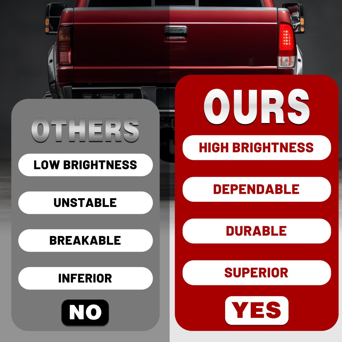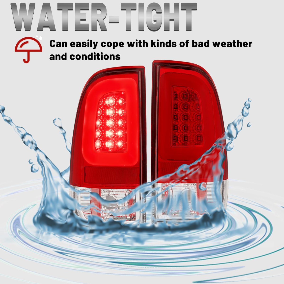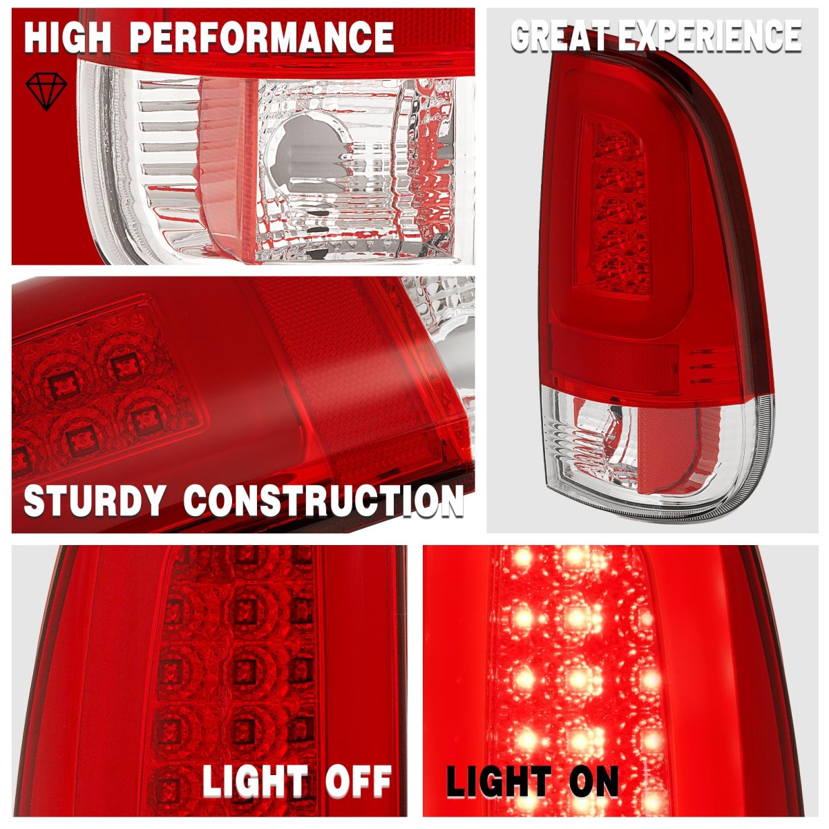 Fitment: Compatible with 1997-2003 Ford F150; Compatible with 2004 Ford F150 Heritage; Compatible with 1997-1999 Ford F250 Light Duty (7 Lug Nut); Compatible with 1999-2007 Ford F250/F350/F450/F550 Super Duty [2-Door Regular Cab 2/3/4-Door Extra Cab 4-Door Crew Cab]. NOTE: Not Compatible on Flareside Models; Not Compatible F150 4-Door Super Crew Models; Not Compatible F150 w/Super Crew Models. High Performance: Direct replacement for F85Z13404CA FO2801117 F85Z13405CA FO2800117. Color: Red lens chrome housing. Made of premium plastic, the lights are durable and sturdy, withstanding various weather conditions to extend their lifespan. Light Design: Brake/parking/turn signal lights feature an attractive design, offering stable light output and high visibility day or night. The LED tube bar and red lens chrome housing enhance your vehicle's stylish and fashionable look. Great Experience: Tail lights enhance visibility from a great distance, especially at night or in bad weather, helping drivers behind you react fast and reducing traffic risks. Package & Installation: A Pair of Tail Lights(Red Lens Chrome Housing) w/LED tube. Included wiring diagrams. No installation accessories. Mounting by screws for replacing damaged or outdated lights.Other fine products