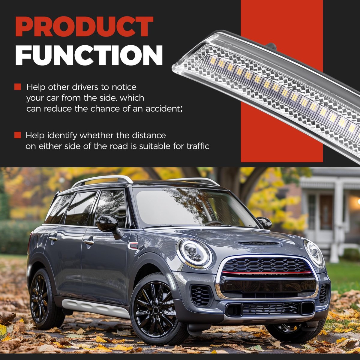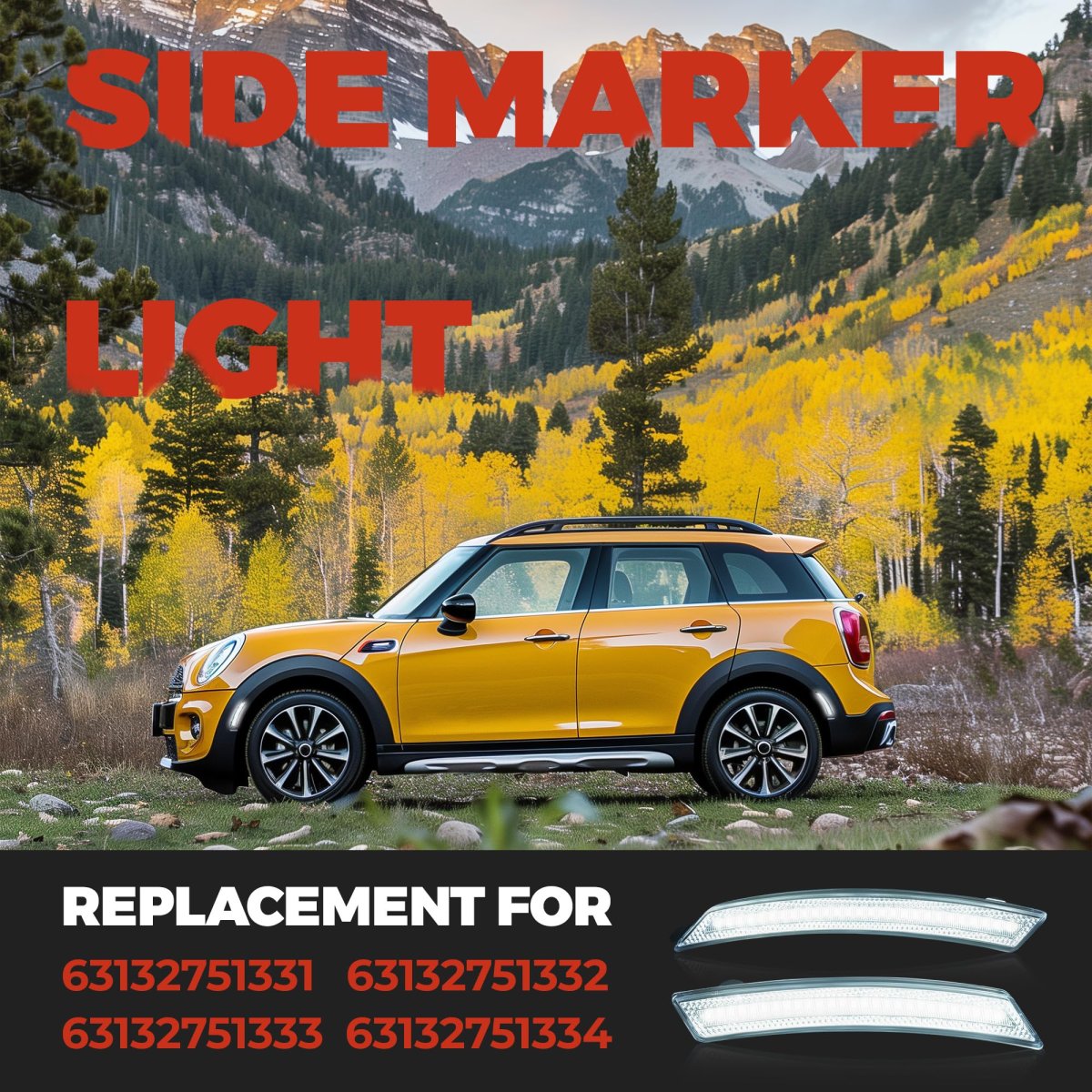 Fitment: The Side marker light compatible with 2008-2014 Mini Cooper R55 Clubman/2007-2013 Mini Cooper R56 Hatch/2009-2015 Mini Cooper R57 Convertible/2012-2015 Mini Cooper R58 Coupe/2012-2015 Mini Cooper R59 Roadster/2011-2015 Mini Cooper R60 Countryman/2013-2015 Mini Cooper R61 Paceman. Replacement for 63132751331 63132751332 63132751333 63132751334. Feature: Material: Plastic. Color: Clear lens. The material is durable and sturdy, make it can withstand external impacts while protecting the integrity of the interior of the fixture. Extend the use time and improve your driving experience. Function: The side marker lights improve the visibility of the driver's field of vision, providing good visibility day or night, even in bad weather, help surrounding drivers notice your vehicle and respond quickly, reduce the incidence of traffic accidents. Package: You will receive 4PCS clear lens white LED side marker lights. Mounting accessories and instructions are not included. Installation: The lights are designed for a direct replacement. Easy and convenient, just replace your damaged one, can be easily installed in a short time, no need to ask for assistance.Other fine products