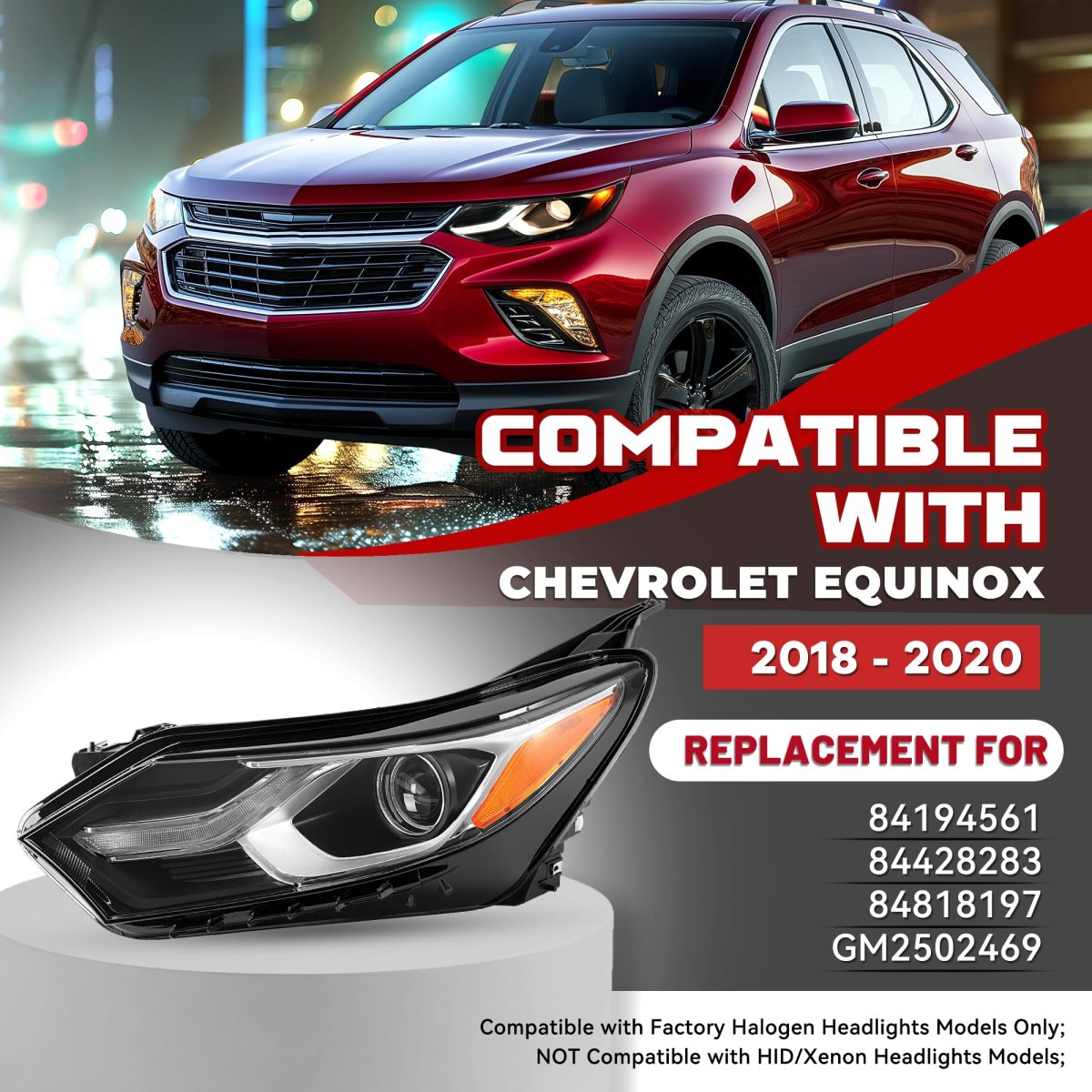 Fitment: Left headlight compatible with 2018 2019 2020 Chevrolet Equinox. Compatible with Factory Halogen Headlights Models Only. NOT Compatible With HID/Xenon Headlights Models. Replacement for GM2502469 84428283. Features: Color: Clear lens+black housing. Position: Driver side. Made of premium plastic, make it sturdy and durable enough to withstand kinds of bad weather and road conditions, extend the usage time of the light. Function: With the headlights, you'll experience greater visibility when driving at night or in low-light conditions. Their advanced lighting technology bring you a brighter light, help you notice the road ahead. Package: You will receive 1 X left headlight (driver side). No mounting hardware. There are wiring diagrams. Installation: Direct installation with screws, easy and quick. Professional installation is always recommended.Other fine products