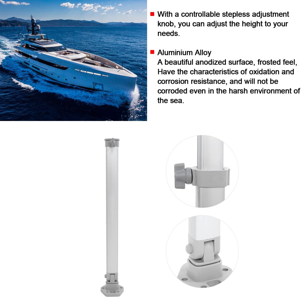 [Easy Installation] The table leg can be easily installed on the table top, and the lock button ensures a secure connection. Lightweight design for convenient installation and use.. [Aluminium Alloy] Features a beautiful anodized with a frosted feel, providing oxidation and for use in harsh sea environments.. [Foldable Design] When not in use, the table legs can be folded away, allowing for space-saving storage. Provides an efficient solution for limited spaces.. [Wide Application] Suitable for RVs, camping cars, , boats, yachts, furniture, indoors, balconies, workshops, kitchens, or cabs. Versatile and practical.. [2 Step Heights] The lowest height is 510mm/20in and the maximum height is 760mm/30in, allowing for flexible adjustment to meet your needs..Other fine products