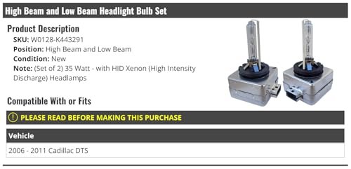 Compatible with or fits: 2006 - 2011 Cadillac DTS. (Set of 2) High Beam and Low Beam Headlight Bulb - 35 Watt. with HID Xenon Headlamps. Review Description to Ensure Proper Fit. OE Quality.