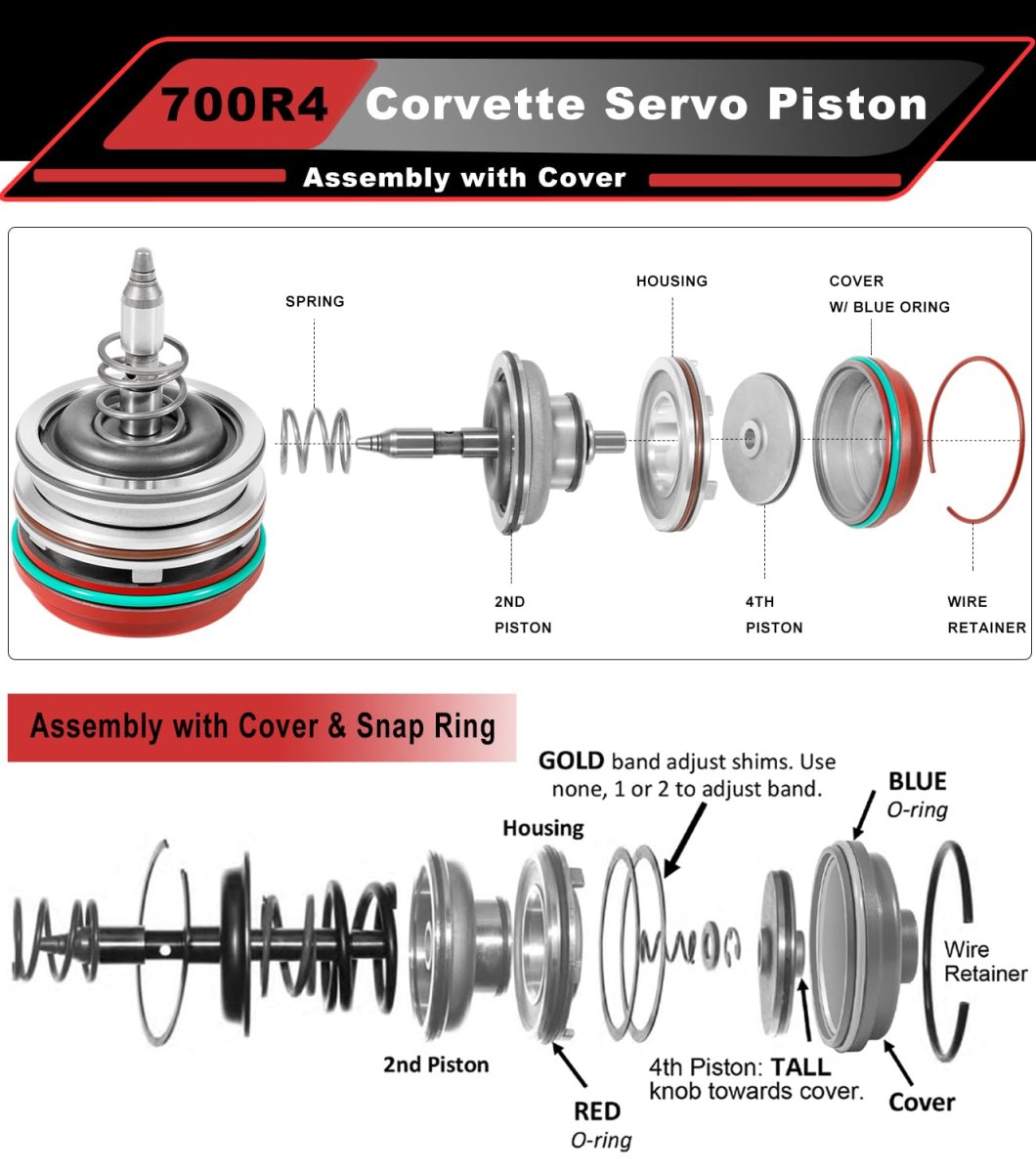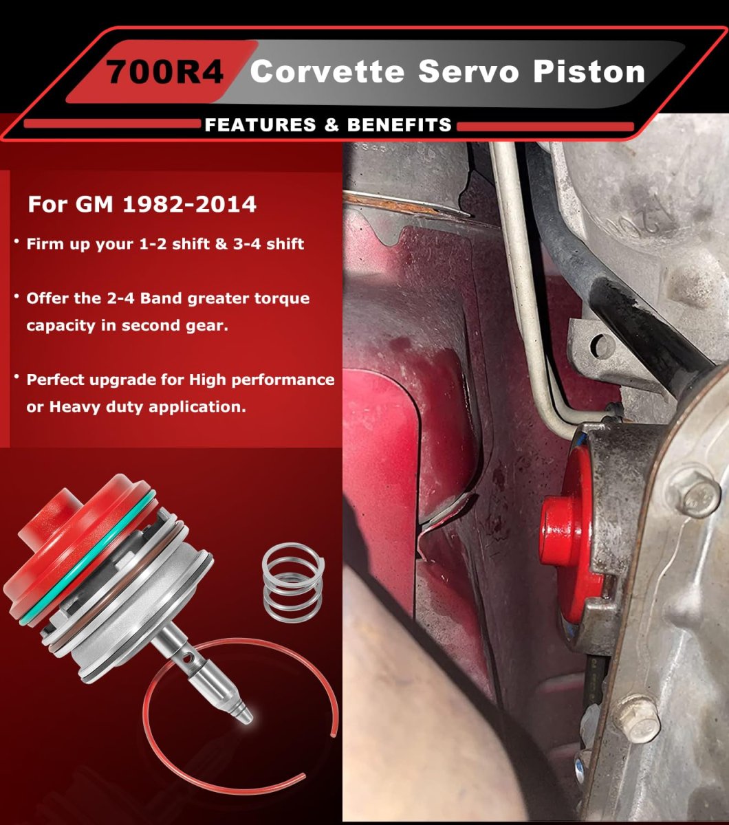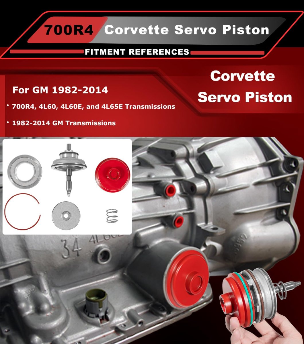 APPLICATION -- This High-Performance 4L60E Servo Kit Suitable for all GM 700R4, 4L60, 4L60E, and 4L65E Transmissions from 1982-2014.. FUNCTION -- To install in your 700R4/4L60E transmission. Modifying your 700R4, 4L60, 4L60E or 4L65E transmission to the High-Performance for Corvette Servo.. BENEFITS -- High performance servo upgrade kit gives the transmissions more "holding" power which allows the transmission to shift more quickly and efficiently from 1st and 2nd gear. Potentially eliminates slipping between 1st and 2nd gear.. EASY TO INSTALL -- Complete drop in replacement. No assembly required and no need to remove the transmission for easy upgrade.. PACKAGE INCLUDED -- Kit contains everything you need to upgrade from the factory Servo. New Corvette Servo Piston Upgrade, Piston Cover, Snap ring, New O-Rings, New Teflon D-Rings.. QUALITY -- Manufactured from material, using top of the line machining and measuring equipment to ensure each part is manufactured to OEM quality standards and specifications. Improved its strength, durability and ensure high performance..